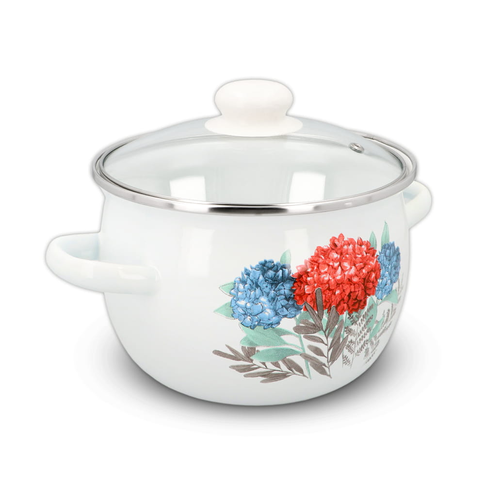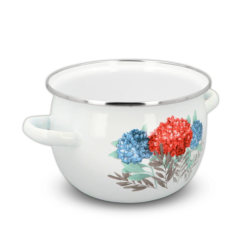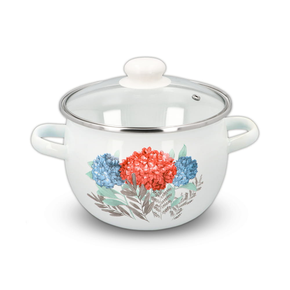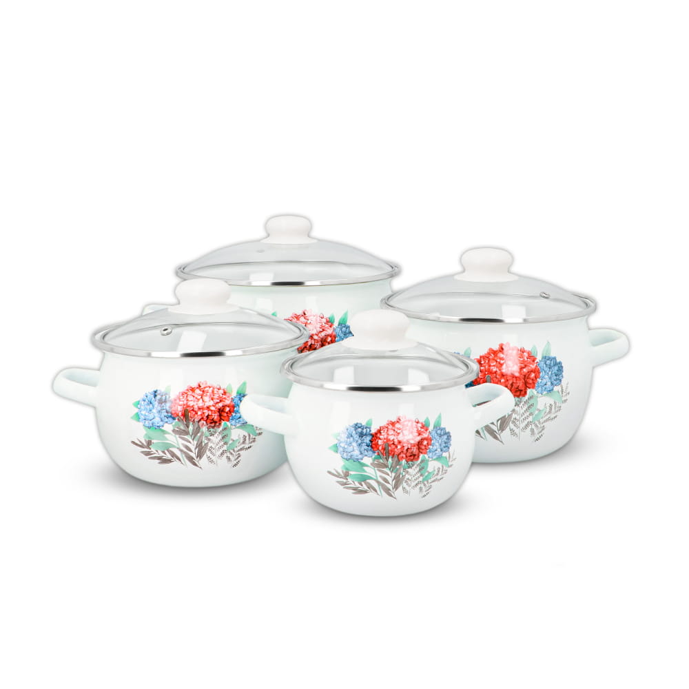 Praktyczny komplet garnków emaliowanych z pokrywkami – cztery garnki o poj. 1,5l, 2,5 l, 3,5l oraz 5,0l. Są niezastąpione w każdej dobrze wyposażonej kuchni! Te tradycyjne, dobre garnki ze szklanymi pokrywkami o pięknym designie, ozdobione motywem kwiatowym, zachwycają swoją estetyką.
