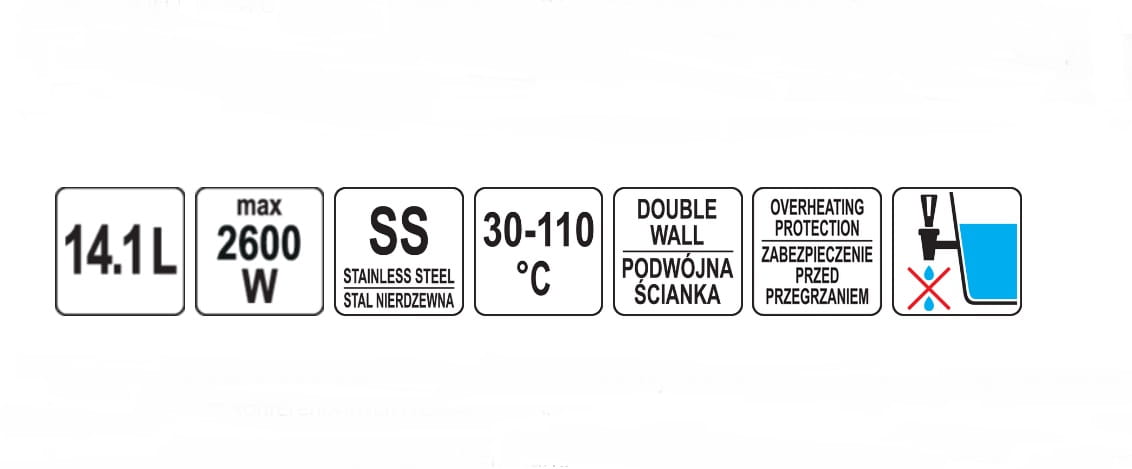 Warnik posiada regulację zakresu pracy w przedziale 30~110°C. Lampki kontrolne sygnalizują grzanie i podtrzymywanie temperatury. Na zewnątrz warnika znajduje się wskaźnik poziomu wody ze skalą w litrach. Po obu stronach warnika są mocne, nienagrzewające się uchwyty do przenoszenia. System TWIST LOCK szczelnie zamyka pokrywkę. Plastikowy kranik zapobiega kapaniu.