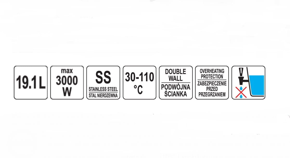 Warnik posiada regulację zakresu pracy w przedziale 30~110°C. Lampki kontrolne sygnalizują grzanie i podtrzymywanie temperatury. Na zewnątrz warnika znajduje się wskaźnik poziomu wody ze skalą w litrach. Po obu stronach warnika są mocne, nienagrzewające się uchwyty do przenoszenia. System TWIST LOCK szczelnie zamyka pokrywkę. Plastikowy kranik zapobiega kapaniu.