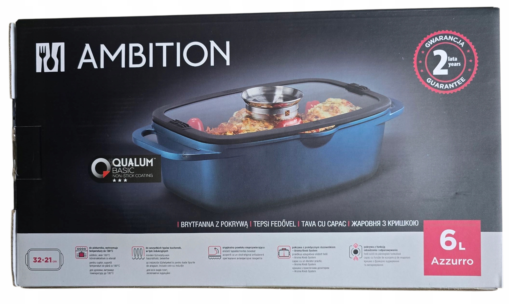 - Wymiary 32 x 21 cm, pojemność 6 l – odpowiednia do średnich porcji mięsa, ryb i zapiekanek