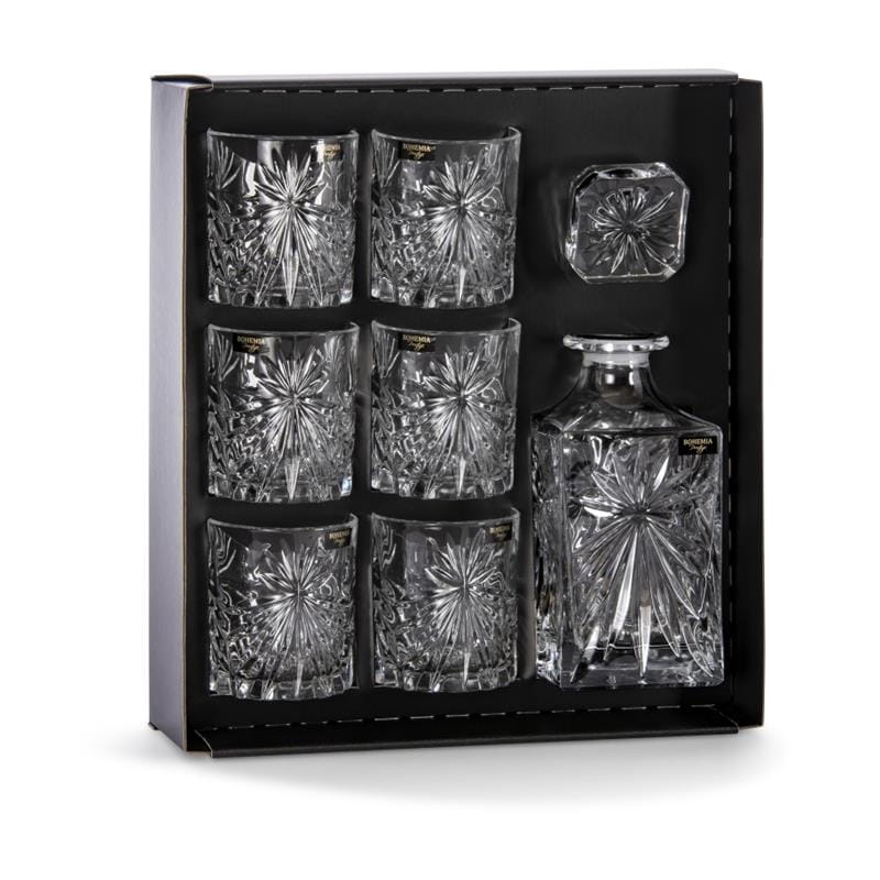 Zestaw do whisky dla prawdziwych koneserów – idealnie nadaje się na prezent, ponieważ posiada eleganckie, bardzo ekskluzywne opakowanie w kolorze czarnym z sygnowanym złotym logo Bohemia Prestige. Wykonany w całości ze szkła kryształowego, które jest nie tylko przejrzyste, bardzo trwałe i pięknie prezentuje się na stole, ale także przyjazne środowisku i w 100% nadaje się do recyklingu. Produkt można myć w zmywarce. W skład produktu wchodzą: karafka oraz 6 szklanek.