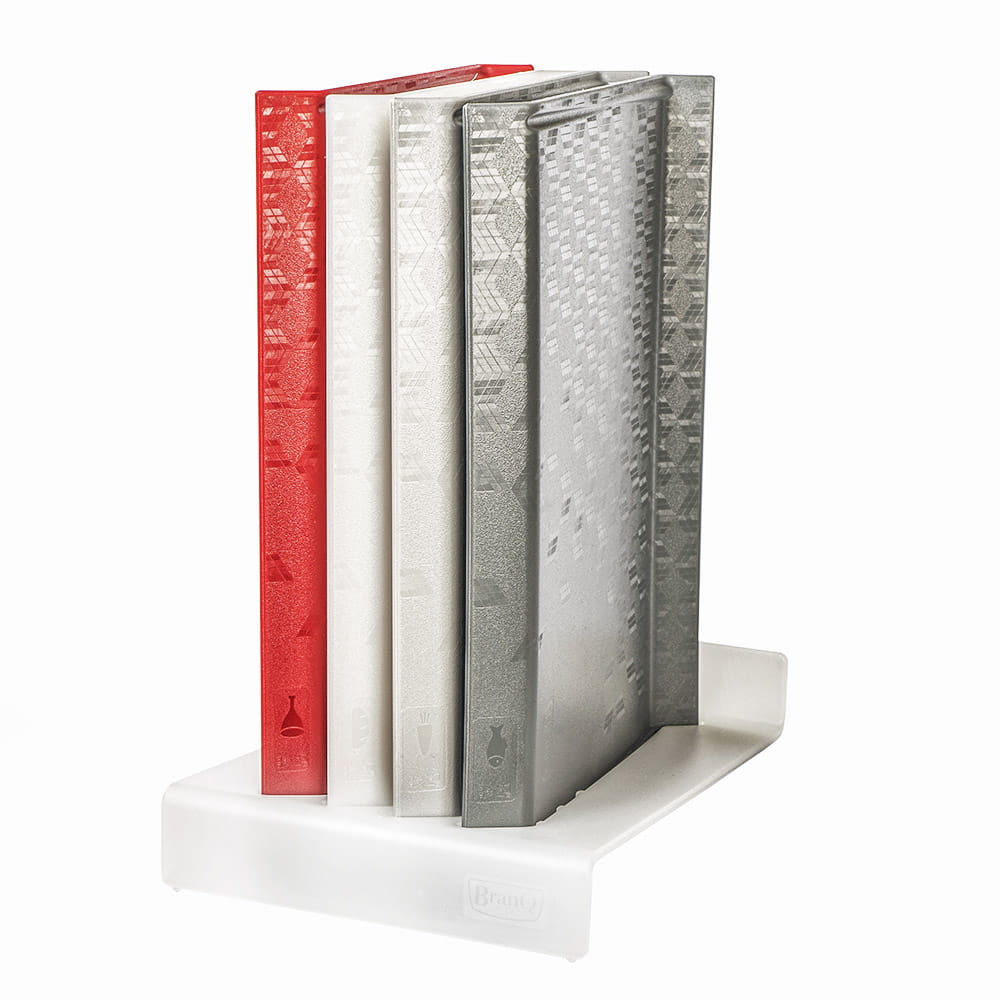 Produkt potrzebny w każdej kuchni. Złożony z czterech solidnie wykonanych desek. W modnych, nowoczesnych kolorach. Każda z nich ma specjalne zagięcie, które można docisnąć do blatu roboczego i mieć pewność, że podczas siekania, krojenia lub cięcia deska się nie przesunie. Specjalny stojak to wielki atut tego produktu. Deski w nim osadzone są stabilnie, stojąc na blacie zawsze są pod ręką. Każda z nich ma znacznik do jakiego typu produktów powinna być użyta.