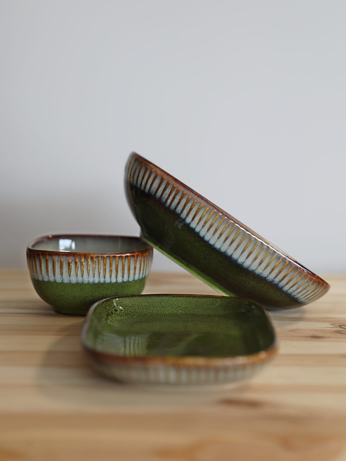 Ceramika z linii OMBRES dostępna jest w mieszance głębokich, naturalnych odcieni: zieleni, ciemnej zieleni oraz granatu. Takie połączenie barw nadaje każdej kuchni ciepły i elegancki charakter. Produkty z tej serii doskonale sprawdzają się zarówno do pieczenia, zapiekania, jak i serwowania dań. Można ich używać w piekarniku, kuchence mikrofalowej oraz myć w zmywarce.