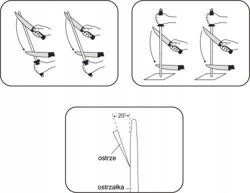 Oprzyj koniec ostrzałki na płaskiej powierzchni. Zachowując odpowiedni kąt ostrzenia (najlepiej 20°) naostrz nóż przesuwając go od rączki do końca ostrzałki.