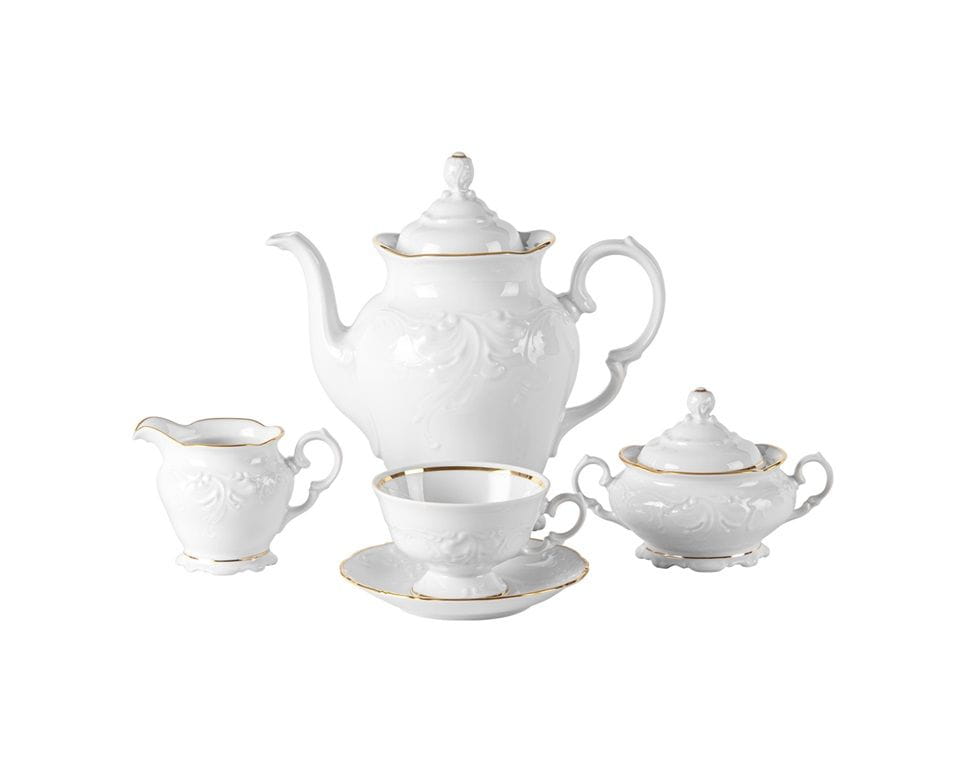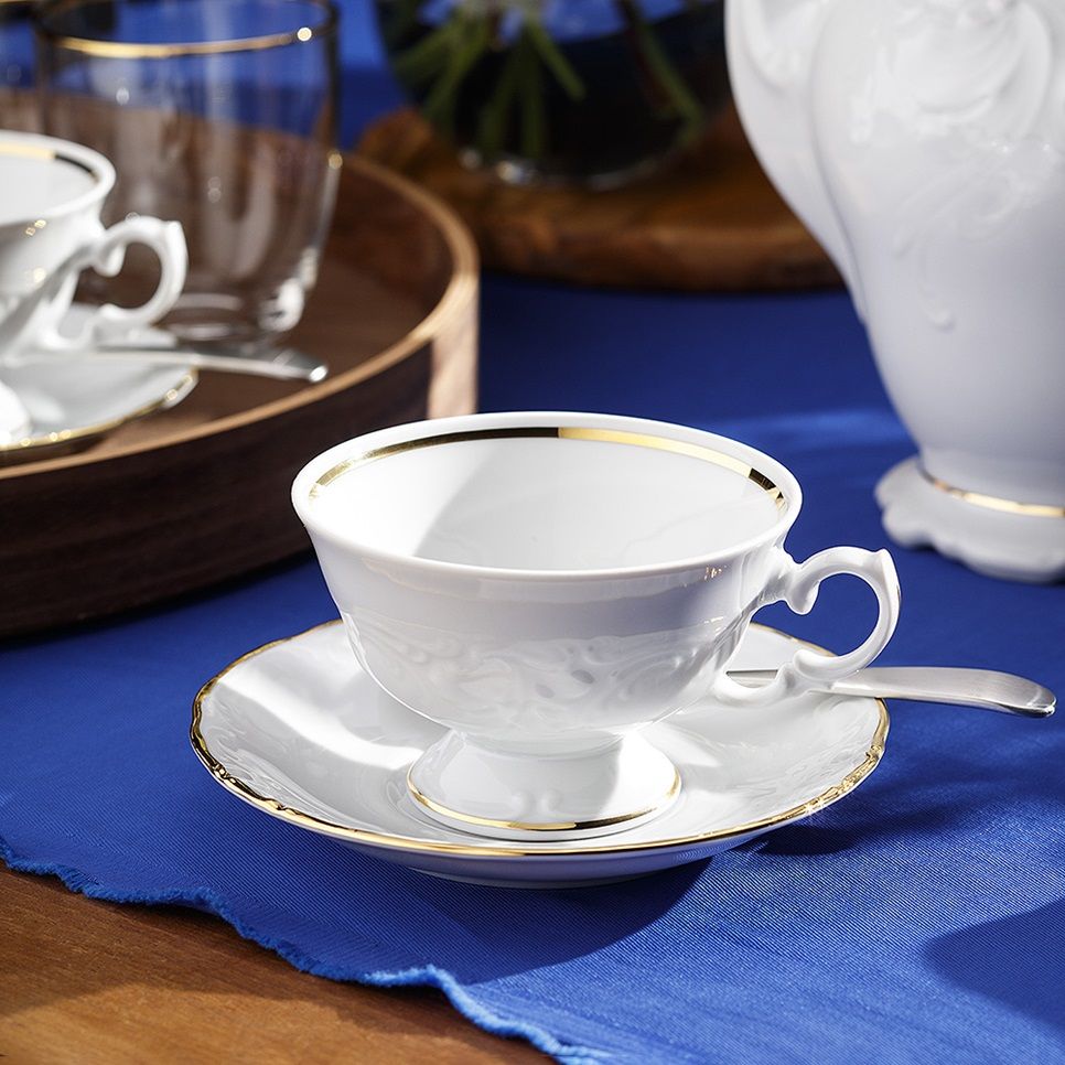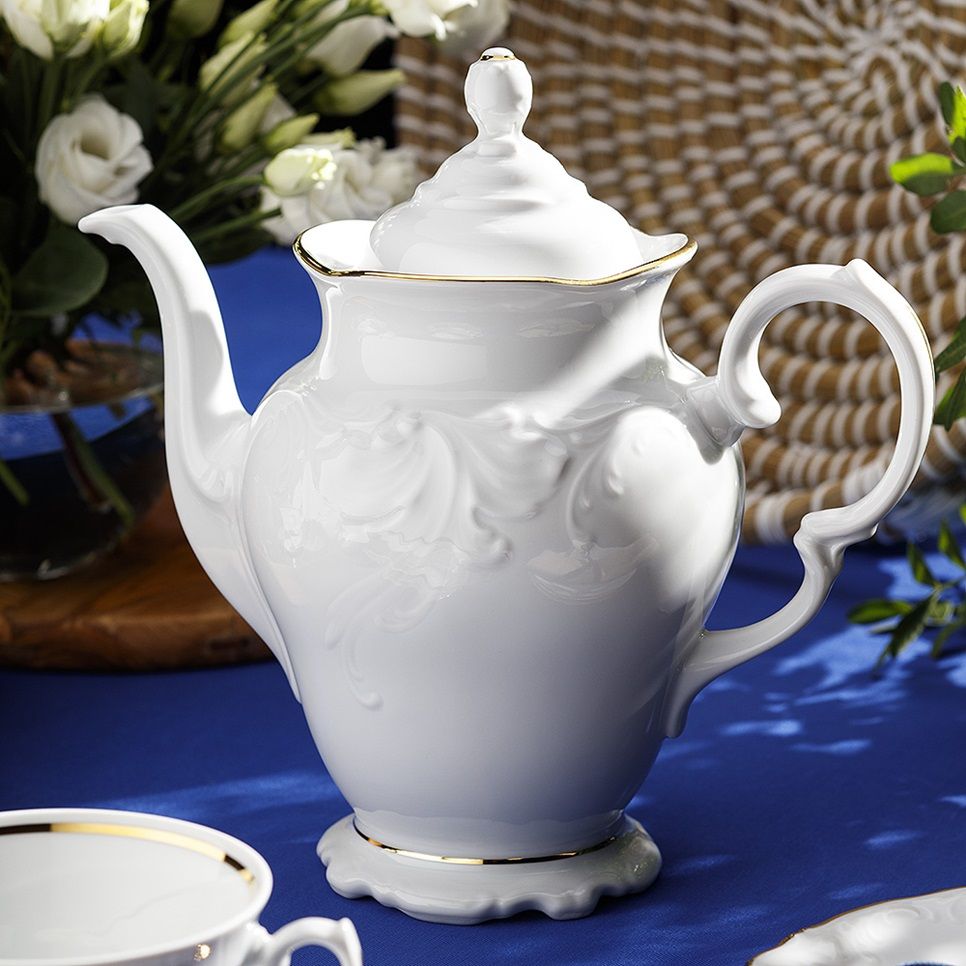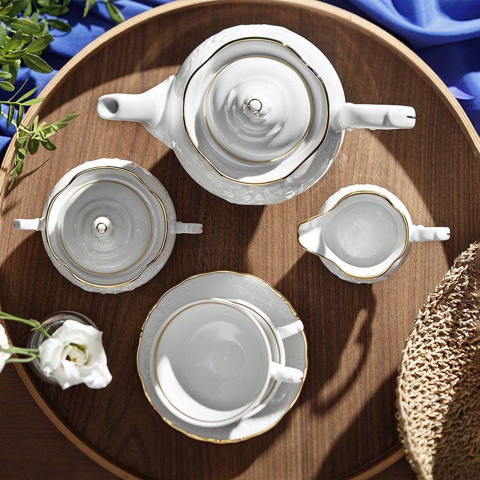 Kolekcja Fryderyka Złota Linia to prawdziwy skarb dla miłośników wyjątkowego stylu i elegancji. Ten serwis kawowy, przeznaczony dla 12 osób, to zbiór 39 niezwykłych elementów, które zachwycają charakterystycznym roślinnym zdobieniem. Każdy element tej kolekcji to arcydzieło rzemiosła, starannie wykonane z klasycznej białej porcelany, której piękno podkreślają złote zdobienia. Delikatne filiżanki na nóżkach, smukły dzbanek i dekoracyjne talerze stały się synonimem luksusu współczesnych czasów.