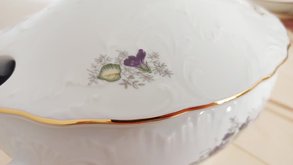Płynna, delikatna forma i harmonijna lina to wybitny przedstawiciel porcelanowej sztuki rękodzielniczej.Rococo wzbogacone o dekorację Fiołki z lat 80 to powrót do przeszłości w pięknym, kobiecym wydaniu.