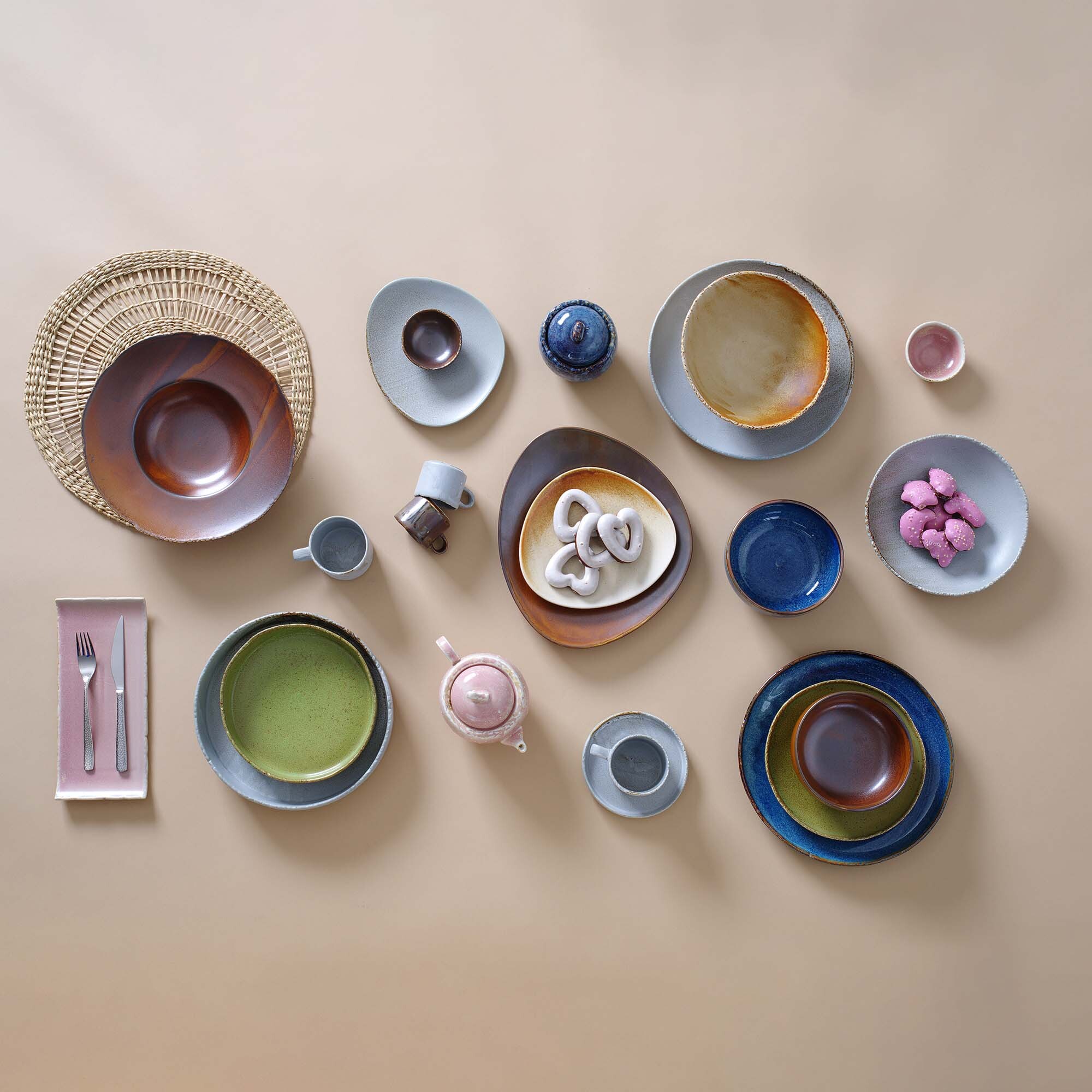 Kolekcja AURUM z linii Kolory Ziemi to porcelana o ciepłej, szlachetnej tonacji i organicznym wykończeniu, które pięknie podkreśla autorską kuchnię i domowe celebracje.