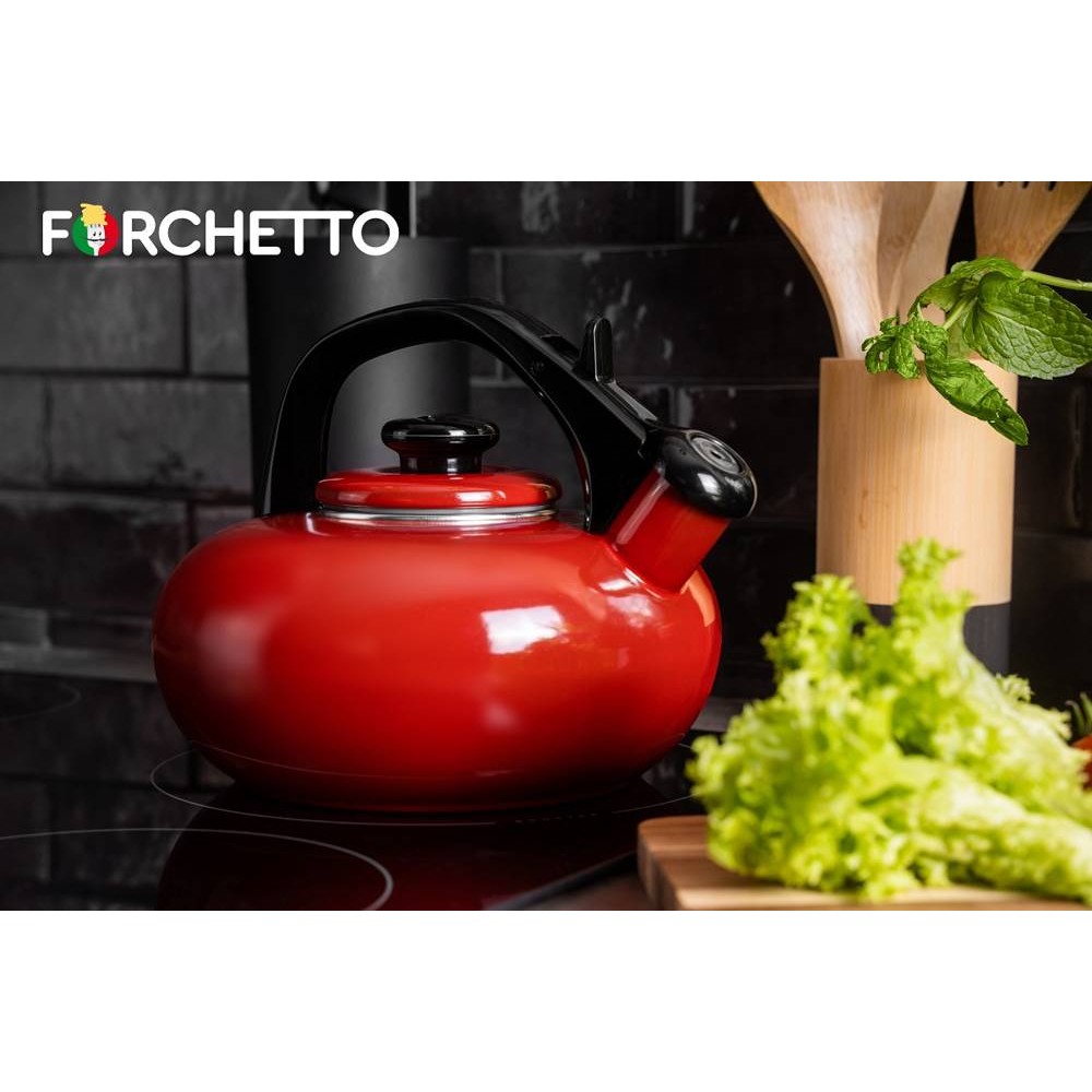 Piękny, ponadczasowy, emaliowany czajnik włoskiej firmy Forchetto o pojemności 2,5l. Doskonale sprawdzi się w tradycyjnych kuchniach a także w nowoczesnych wnętrzach.