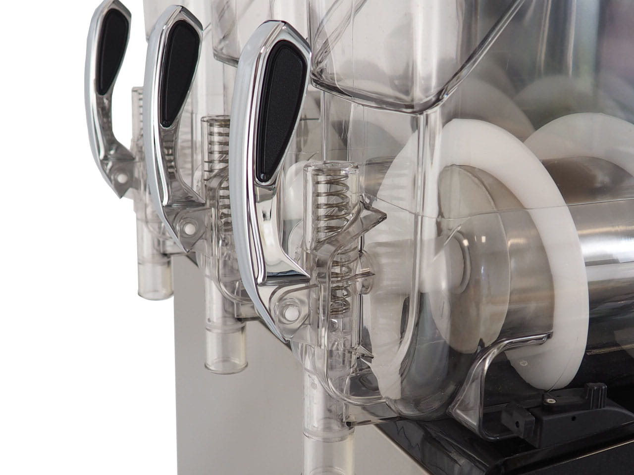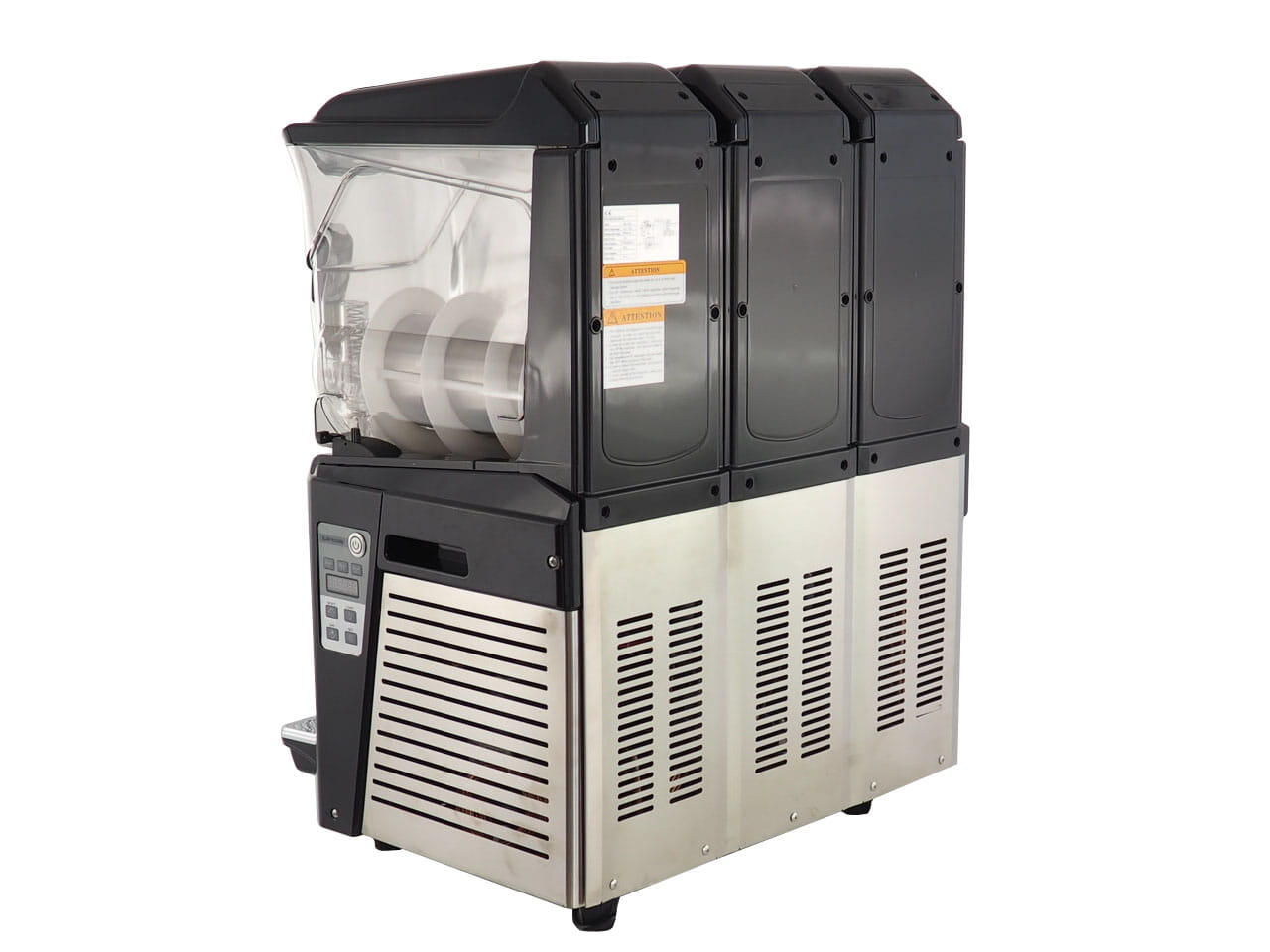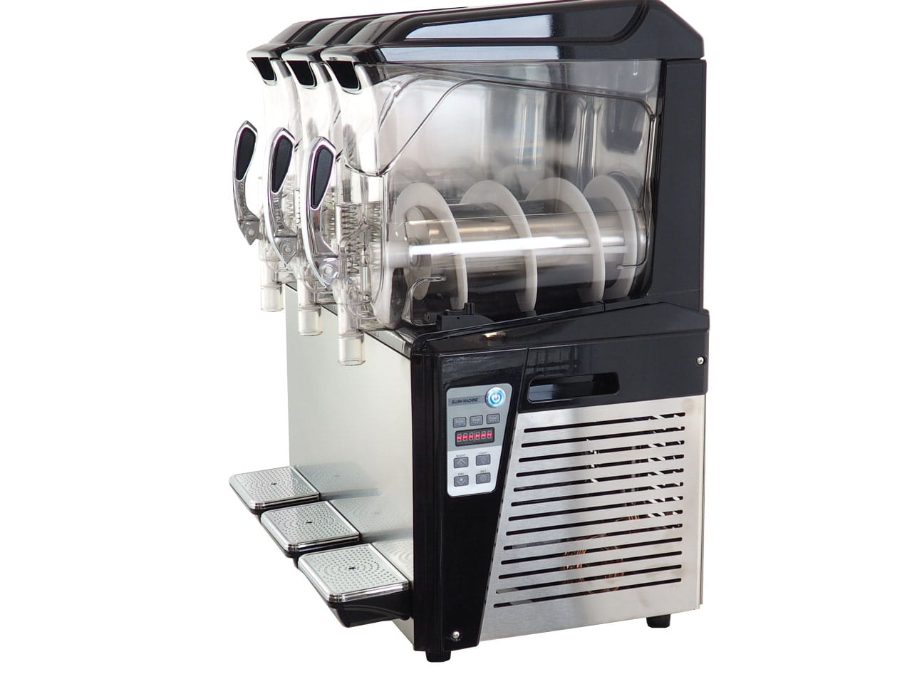 Trzy komory pracy o pojemności 10L każda mogą być trzema różnymi kolorami, co dodatkowo zwiększa atrakcyjność punktu serwującego slushie. Trzy różne smaki to trzykrotnie większa szansa na to, że Klient zdecyduje się na któryś z nich! Sterowanie urządzeniem jest bardzo łatwe i intuicyjne, a proces mieszania dokładny i pozwala na uzyskanie perfekcyjnej konsystencji.