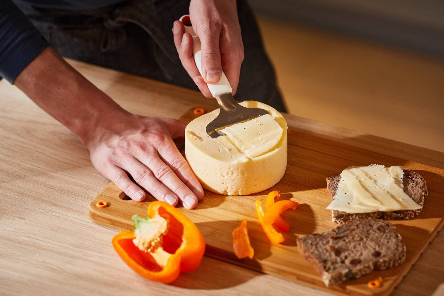 Umożliwia odcinanie plastrów sera bez przyklejania do ostrza.