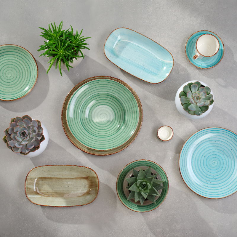 Porcelanowa zastawa stołowa została ozdobiona we wzór okręgów w kolorach czerwieni, zieleni, błękitu, czerni oraz beżu. Kolekcję uzupełniają spokojniejsze kremowe elementy, ozdobione charakterystyczną dla kolekcji dekoracją na brzegu. Jest nie tylko efektowna, ale też praktyczna - z uwagi na wysoką trwałość i odporność porcelany, można myć ją w zmywarce, a także używać do podgrzewania potraw w piekarniku i kuchence mikrofalowej.