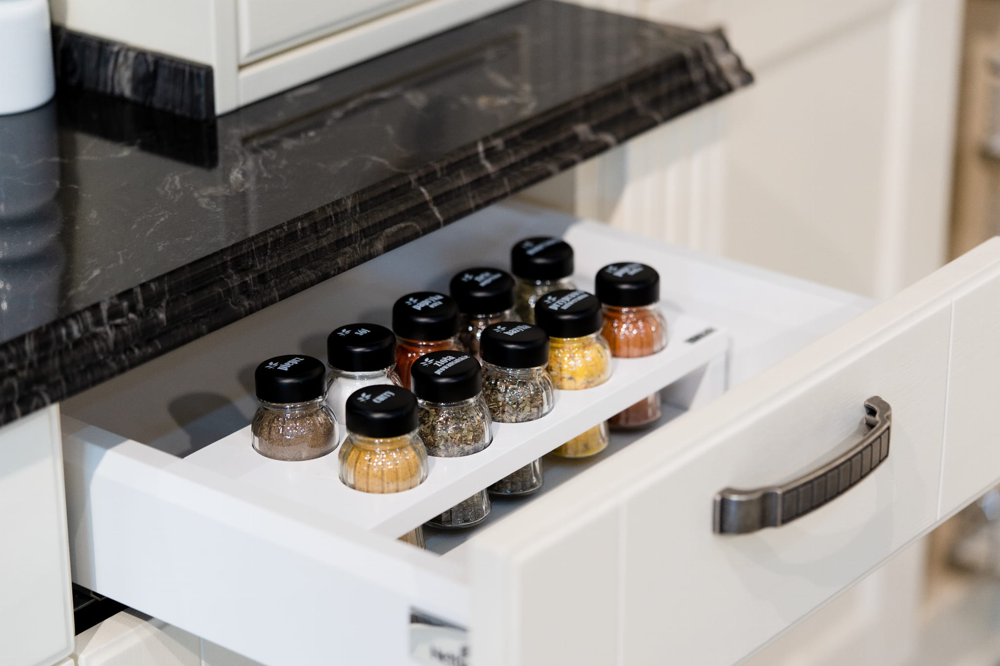 Nowoczesna, funkcjonalna a zarazem elegancka forma, pozwala na postawienie organizera na blacie kuchennym, umieszczeniu go w szafce, szufladzie lub cargo. Każde rozwiązanie wprowadzi ład i porządek, dodatkowo usprawni i umili kuchenne czynności związane z wykorzystaniem aromatycznych przypraw, tak byś mógł bez przeszkód cieszyć się przygotowywaniem ulubionych potraw. Wszystkie przyprawy w jednym miejscu, zawsze po ręką.