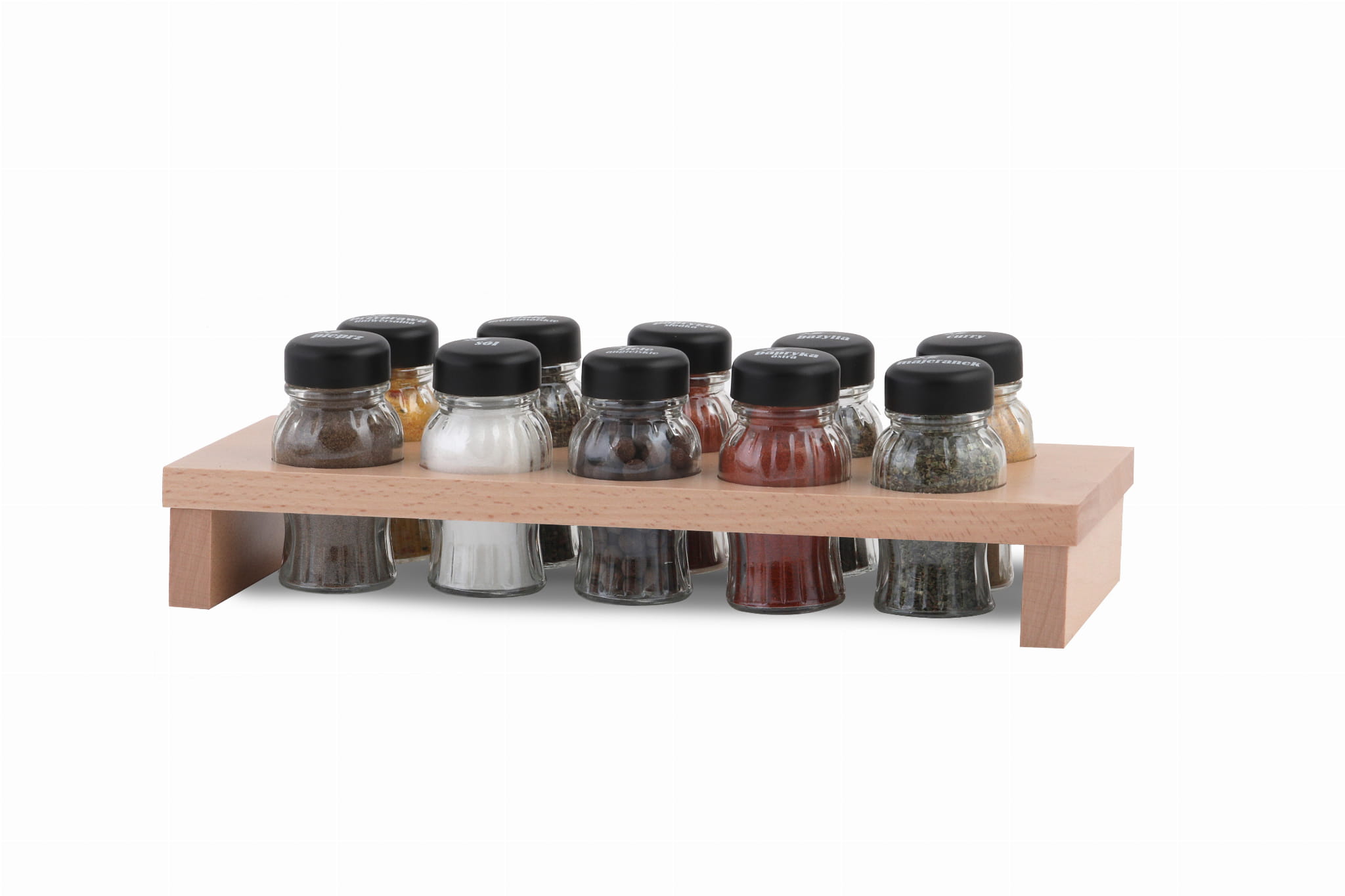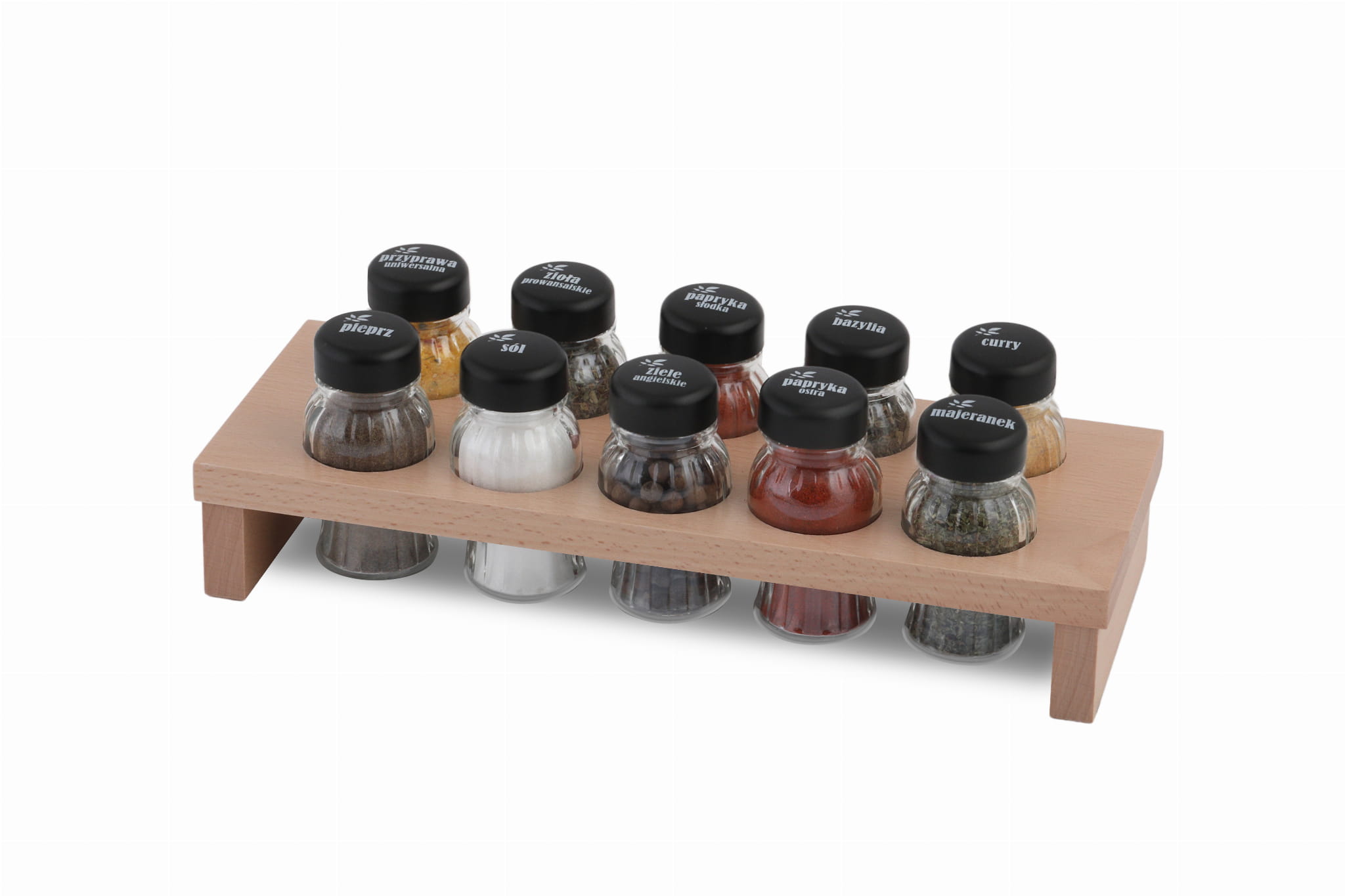 - 10 słoików na przyprawy: pieprz, sól, papryka ostra, papryka słodka, majeranek, ziele angielskie, przyprawa uniwersalna, zioła prowansalskie, curry, bazylia