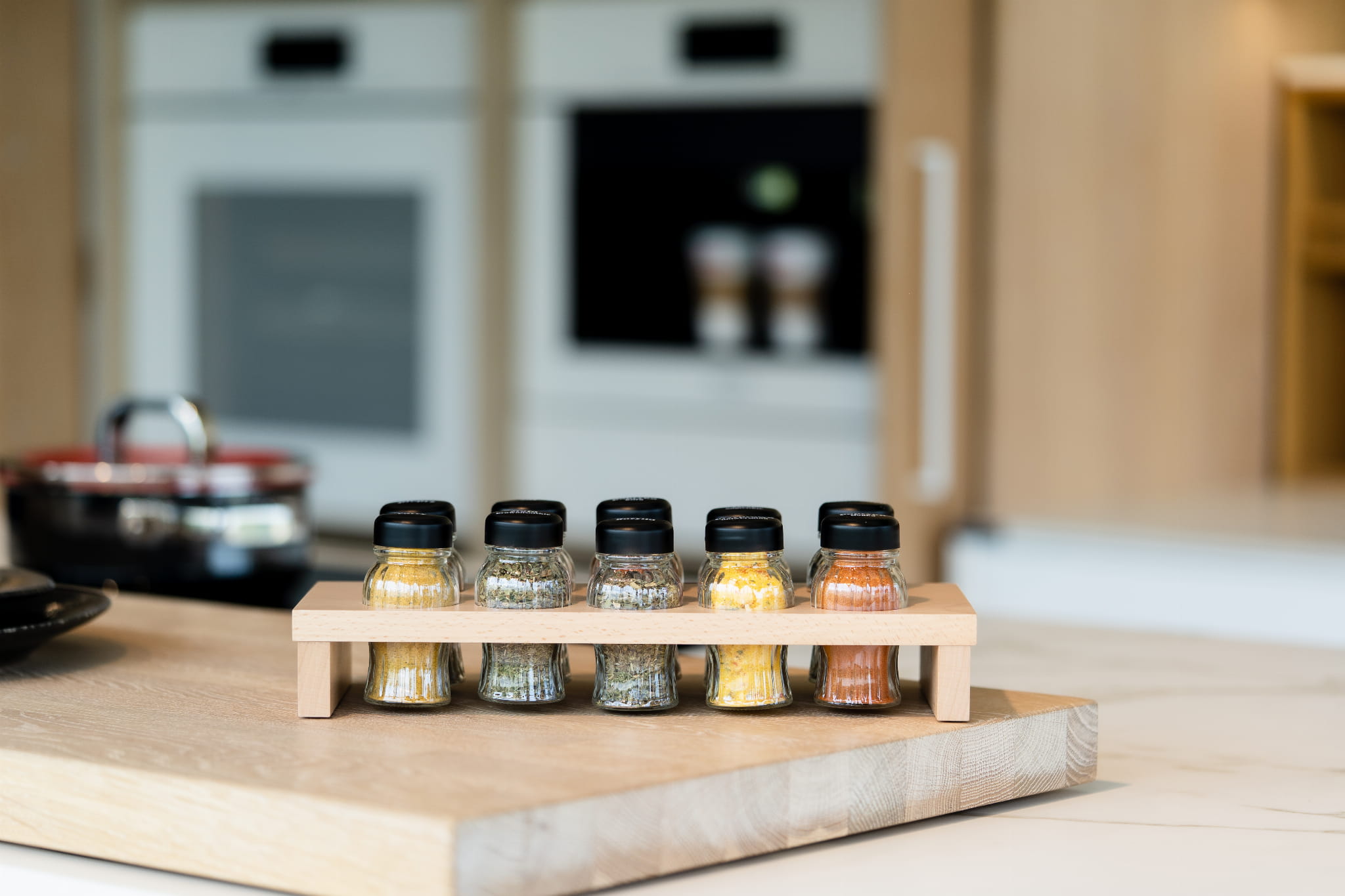 Komfort użytkowania zapewnia stabilny stojak, wykonany ręcznie z drewna bukowego, pokrytego nietoksycznym lakierem wodnym oraz dedykowane, szczelne i ergonomiczne słoiczki z polskiej huty szkła. Idealnie dobrana średnica otworu w stojaku, zapewnia łatwe wyjmowanie, natomiast napis z nazwą przyprawy na nakrętce oraz transparentny, szklany słoik umożliwiają bezproblemową identyfikację szukanego produktu. Sitko w słoiczkach z drobno zmielonymi zapewnia precyzyjne dozowanie, ochronne nakładki umieszczone na spodzie zapobiegające rysowaniu powierzchni, to dodatkowe atuty organizera.