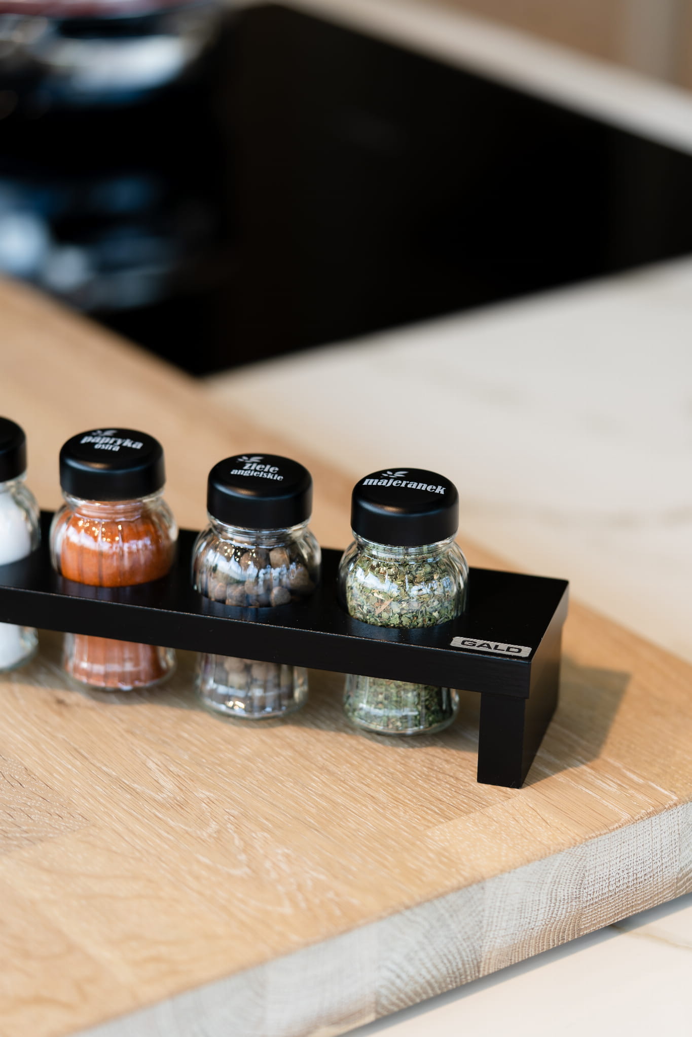 Komfort użytkowania zapewnia stabilny stojak, wykonany ręcznie z drewna bukowego, pokrytego nietoksycznym lakierem wodnym oraz dedykowane, szczelne i ergonomiczne słoiczki z polskiej huty szkła. Idealnie dobrana średnica otworu w stojaku, zapewnia łatwe wyjmowanie, natomiast napis z nazwą przyprawy na nakrętce oraz transparentny, szklany słoik umożliwiają bezproblemową identyfikację szukanego produktu. Sitko w słoiczkach z drobno zmielonymi zapewnia precyzyjne dozowanie, ochronne nakładki umieszczone na spodzie zapobiegające rysowaniu powierzchni, to dodatkowe atuty organizera.