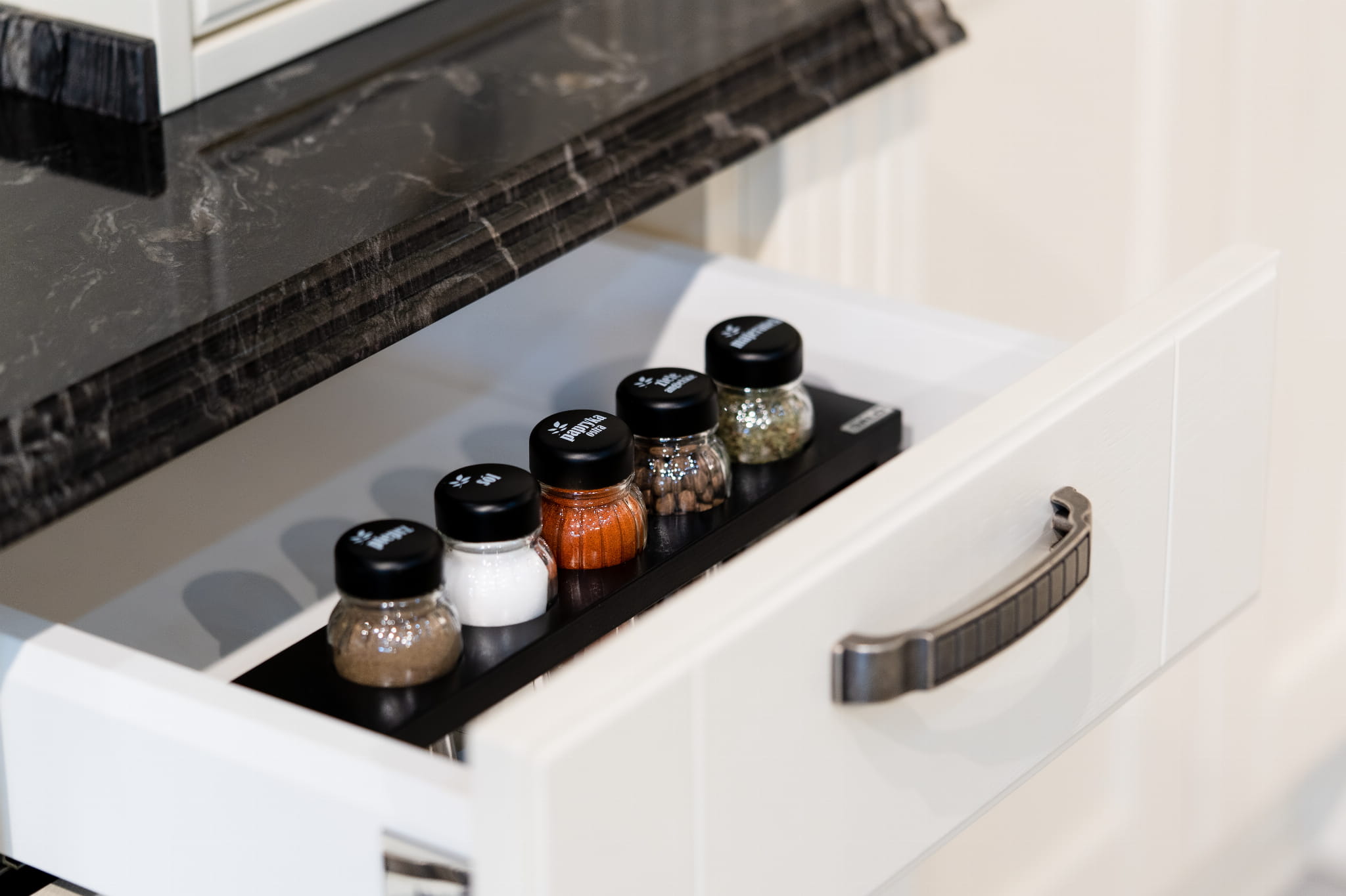 Nowoczesna, funkcjonalna a zarazem elegancka forma, pozwala na postawienie organizera na blacie kuchennym, umieszczeniu go w szafce, szufladzie lub cargo. Każde rozwiązanie wprowadzi ład i porządek, dodatkowo usprawni i umili kuchenne czynności związane z wykorzystaniem aromatycznych przypraw, tak byś mógł bez przeszkód cieszyć się przygotowywaniem ulubionych potraw. Wszystkie przyprawy w jednym miejscu, zawsze po ręką.