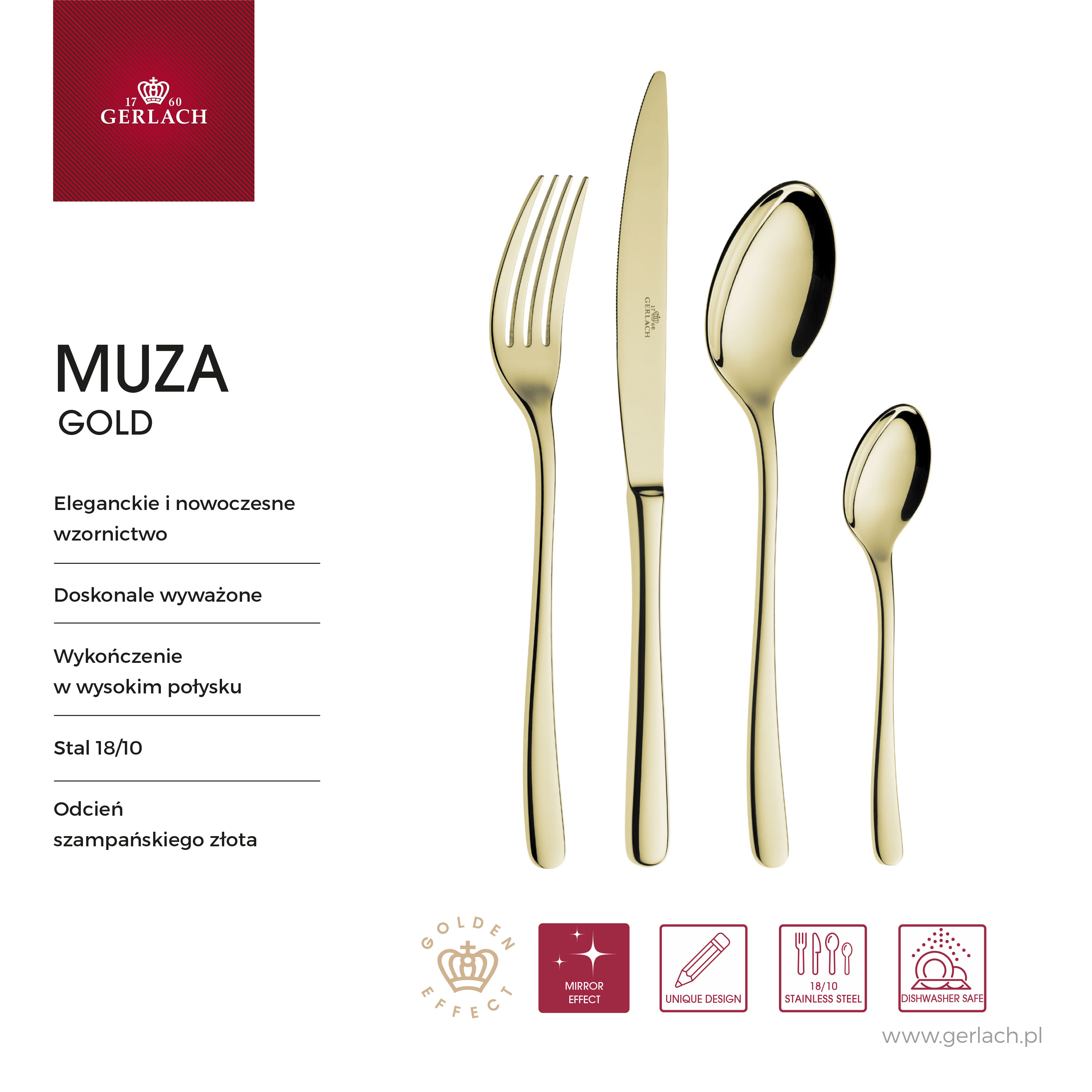 Sztućce MUZA GOLD wykonano z wysokiej jakości stali nierdzewnej 18/10 i wykończono w wysokim połysku. Elegancki odcień szampańskiego złota wyróżnia je na tle klasycznych, srebrnych kompletów, nadając aranżacjom stołu niepowtarzalny i luksusowy charakter. Szczególnie efektownie prezentują się w zestawieniu z porcelaną w kolorze kości słoniowej, podkreślając jej ciepłe tony.