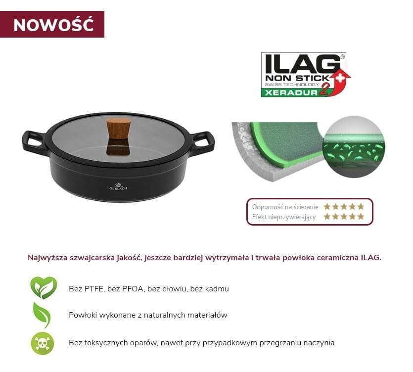 Garnek NATUR 28cm z powłoką Ilag Xera Dur 2 ® Ceramic Non Stick.Powłoka jest w pełni bezpieczna dla zdrowia – nie zawiera szkodliwych substancji takich, jak PTFE, PFOA, a pod wpływem ciepła nie wydziela toksycznych oparów. Jej wierzchnia warstwa z Xerogelem minimalizuje również pękanie pod wpływem ciepła.