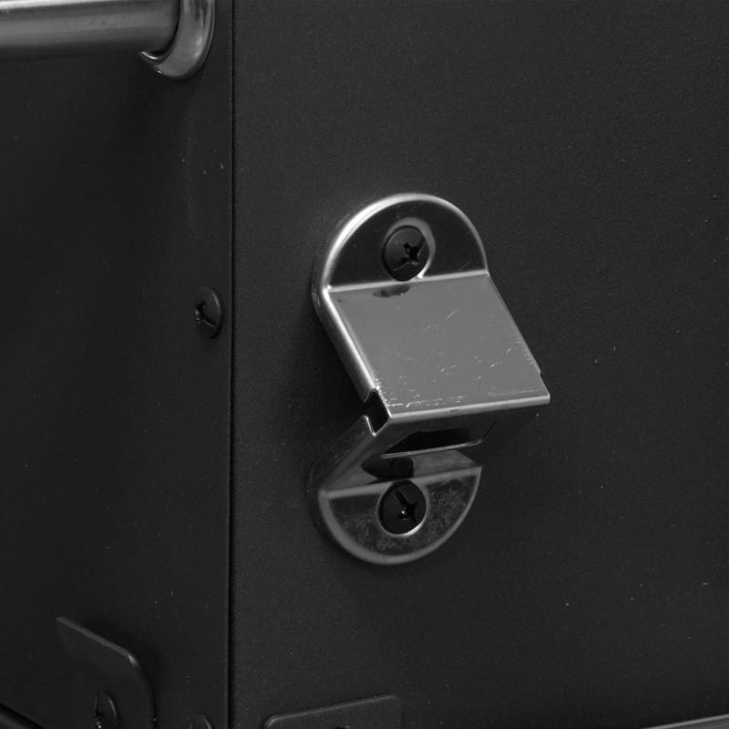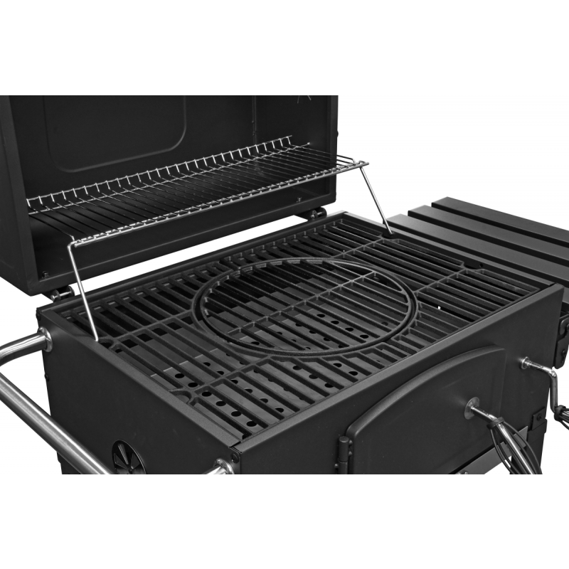 - Funkcjonalność grilla podnosi składana półka boczna, druciana półka dolna oraz uchwyt grilla ze stali szlachetnej ze zintegrowanym otwieraczem do butelek.