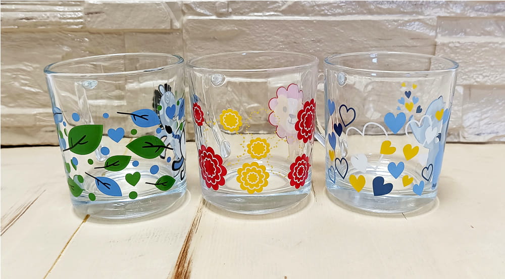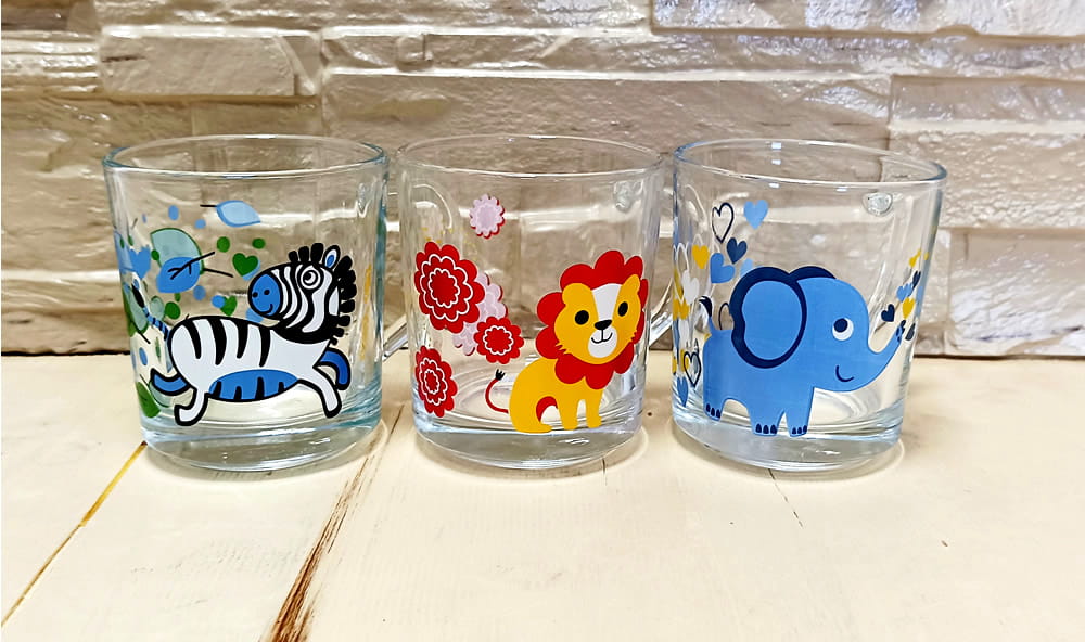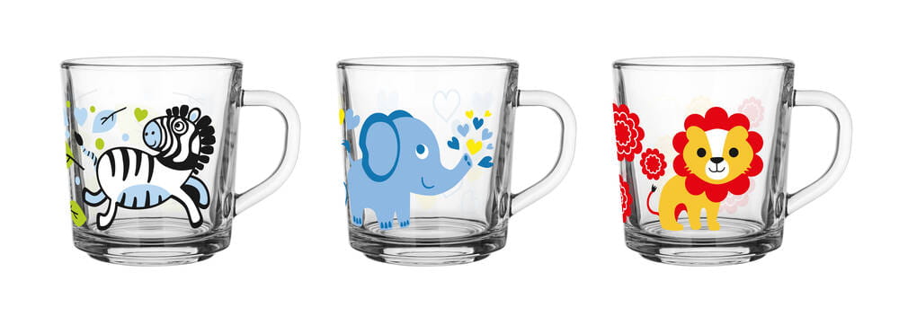 Zestaw 3 ślicznych szklanych kubeczków o pojemności 220 ml wykonanych ze wysokiej jakości szkła, przyozdobionych słodkimi zwierzakami, które z pewnością wywołają uśmiech na twarzy każdego dziecka.