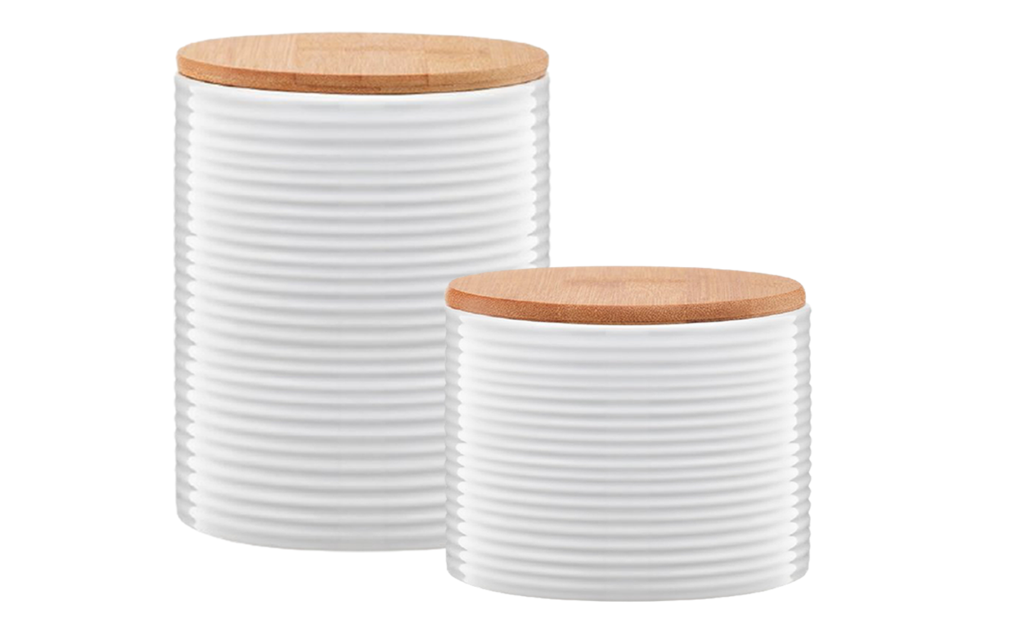 Świetnie wyglądający i praktyczny zestaw pojemników ceramicznych ze szczelną bambusową pokrywą o pojemności 1,1l oraz 0,67l