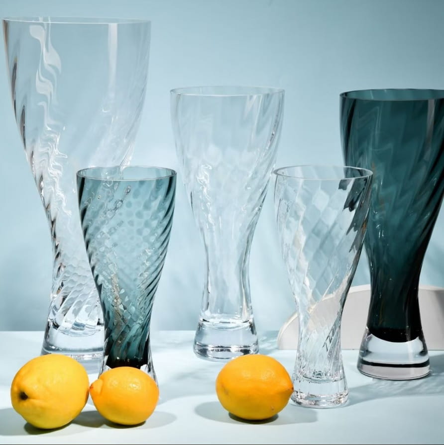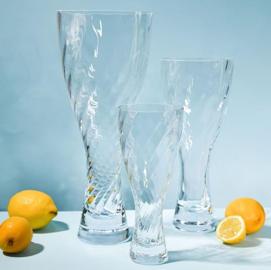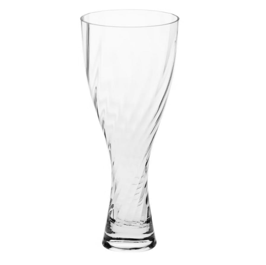 Wysoki wazon ma oryginalny kształt nowoczesnego pucharu. Wazon o wysokości aż 40 cm został wykonany tradycyjną metodą ręczną. Dodatkowo wazon został ozdobiony skręcaną fakturą, tzw. optykiem. Grube dno zapewnia mu stabilność.