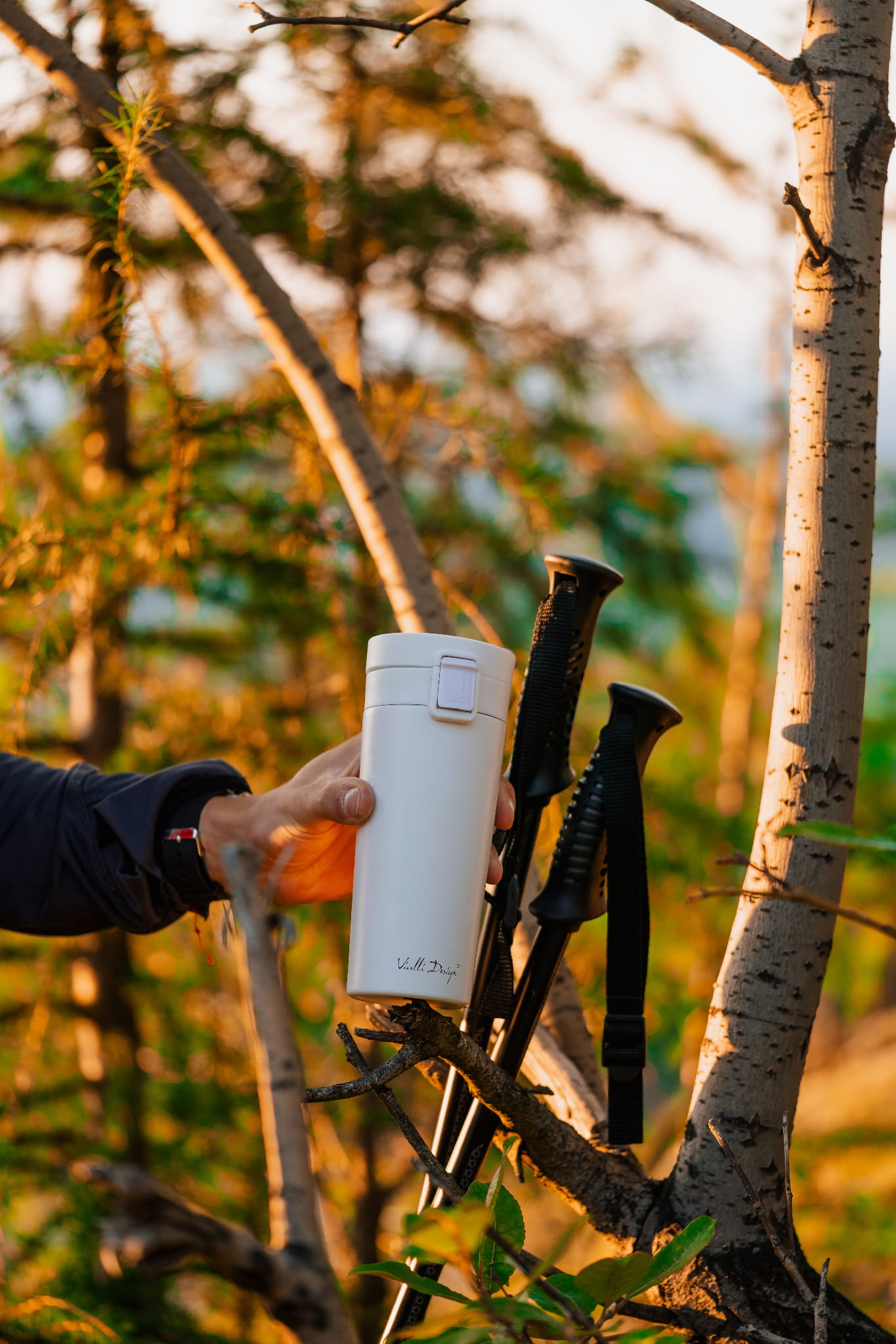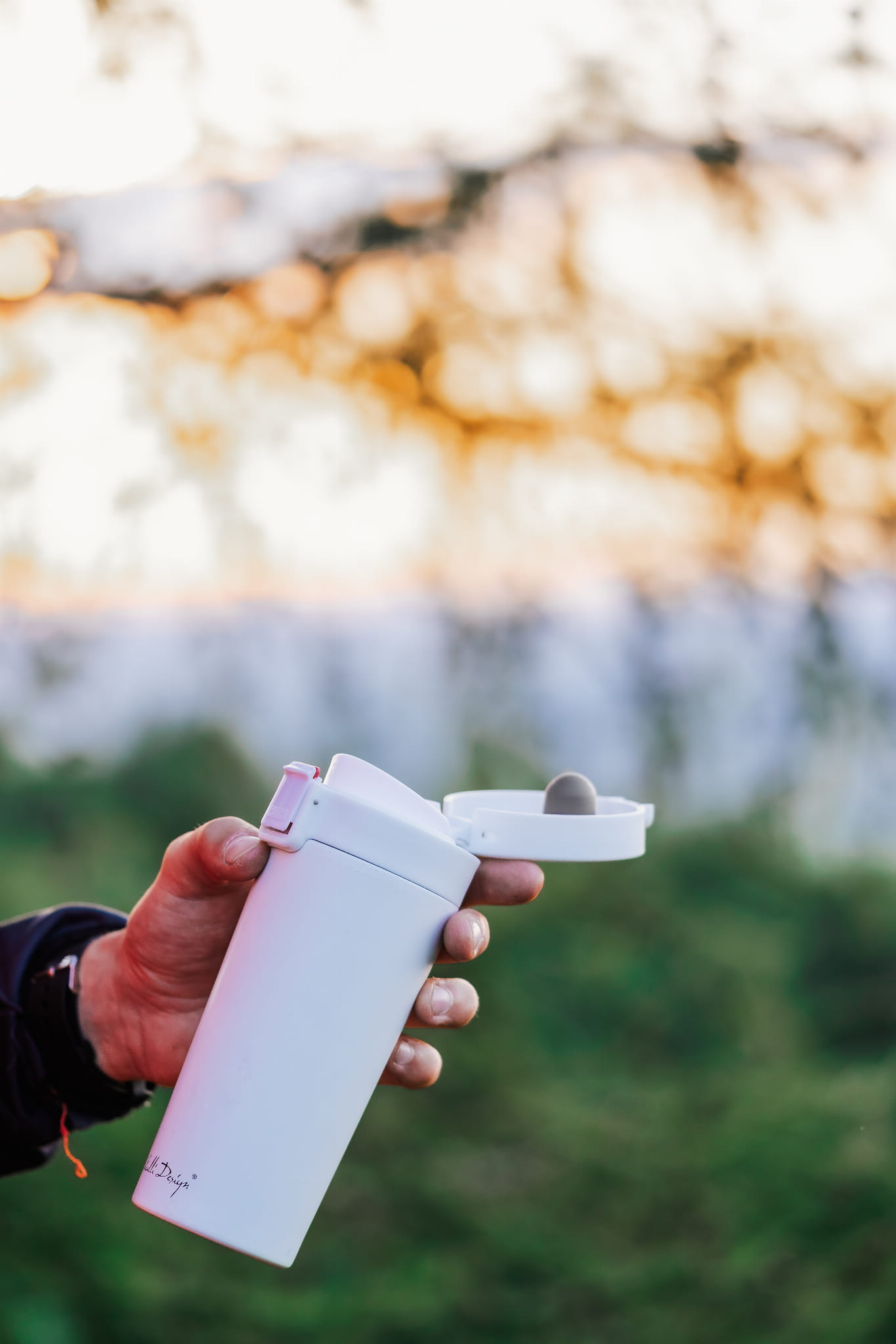 Decydując się na kubek termiczny Fuori, mamy możliwość wybrania naczynia w odpowiadającym nam wariancie kolorystycznym. Dostępne kolory to biały, różowy, granatowy, zielony, grafitowy, miętowy, stalowy matowy i czarny rose gold – każdy znajdzie coś dla siebie. Otwarcie kubka przy pomocy kciuka jest niezwykle proste, a przed przypadkowym rozlaniem napoju skutecznie chroni przycisk z blokadą.