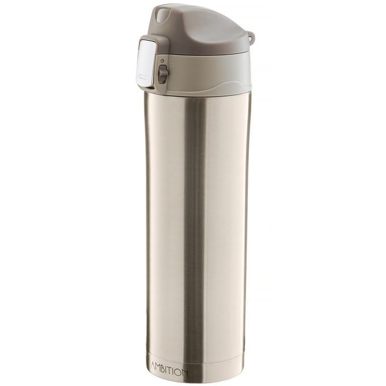 Kubek termiczny z blokadą 420 ml Glossy, marki Ambition w pięknym i delikatnym złotym kolorze z szarymi i srebrnymi akcentami. Kubek posiada podwójną ściankę oraz wkład ze stali nierdzewnej, co zapewnia większą ochronę przed utratą właściwej temperatury napoju. Specjalny mechanizm blokujący zabezpiecza przed przypadkowym otwarciem kubka, a wyprofilowany ustnik ułatwia picie. Kubek świetnie nadaje się zarówno do pracy, jak i podczas podróży. Może być używany zarówno do zimnych, jak i gorących napojów.