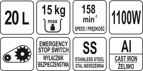 Napędzany jest silnikiem o mocy 1500W, zasilany prądem 220~240V / 50Hz, za pomocą przekładni zębatkowej, która gwarantuje bardzo długą żywotność mechanizmu i użytkowania.