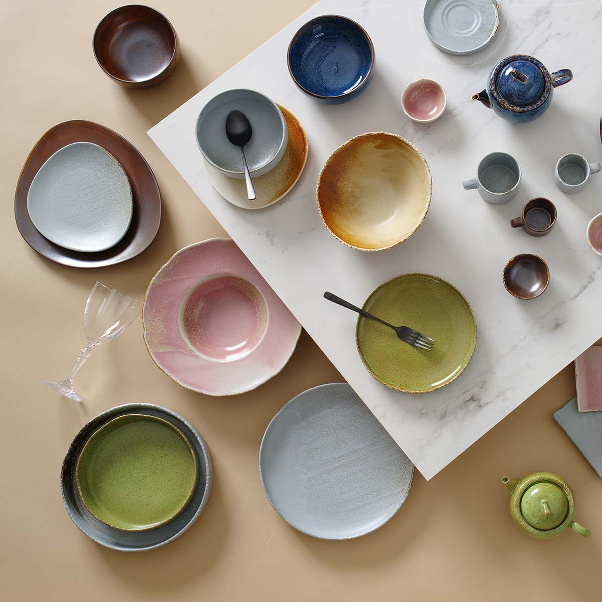 Seria naczyń wyróżniająca się unikalnym połączeniem kolorów: Eminence (niebieski), Constancy (brązowy), Rosa (różowy) oraz Edenic (zielony). Zastosowane zdobienia oddają organiczny, rzemieślniczy charakter i przywodzą na myśl subtelny taniec pędzla na płótnie. Dzięki ręcznemu wykończeniu każdy element ma indywidualny wygląd, co oznacza, że kolor i tekstura mogą się różnić od tych prezentowanych na zdjęciach. Kolekcje te łączą trwałość wysokiej jakości porcelany z artystycznym wzornictwem, tworząc naczynia idealne zarówno dla profesjonalnych szefów kuchni, jak i osób poszukujących wyjątkowych rozwiązań do swoich domów. Oferta obejmuje zarówno zastawę stołową, jak i elementy takie jak miski bufetowe, które doskonale nadają się do prezentacji dań podanych na stołach bufetowych, podkreślając wyjątkowy charakter każdej aranżacji.