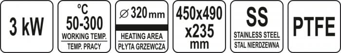 Grzałka o mocy 3,0kW posiada sterowanie za pomocą potencjometru z regulacją temperatury pracy w zakresie 50~300ºC, który umieszczony jest na panelu frontowym. Obok umieszczony jest bryzgoszczelny wyłącznik, który umożliwia wyłączenie urządzenia, bez konieczności odłączania przewodu zasilającego z sieci. Naleśnikarka zasilana jest prądem 230V~50Hz. Wbudowany bezpiecznik zapobiega przed przegrzaniem się urządzenia.
