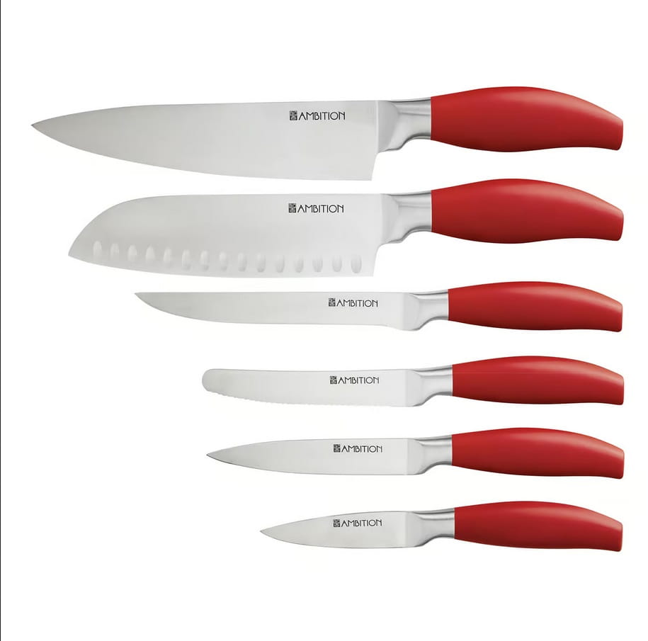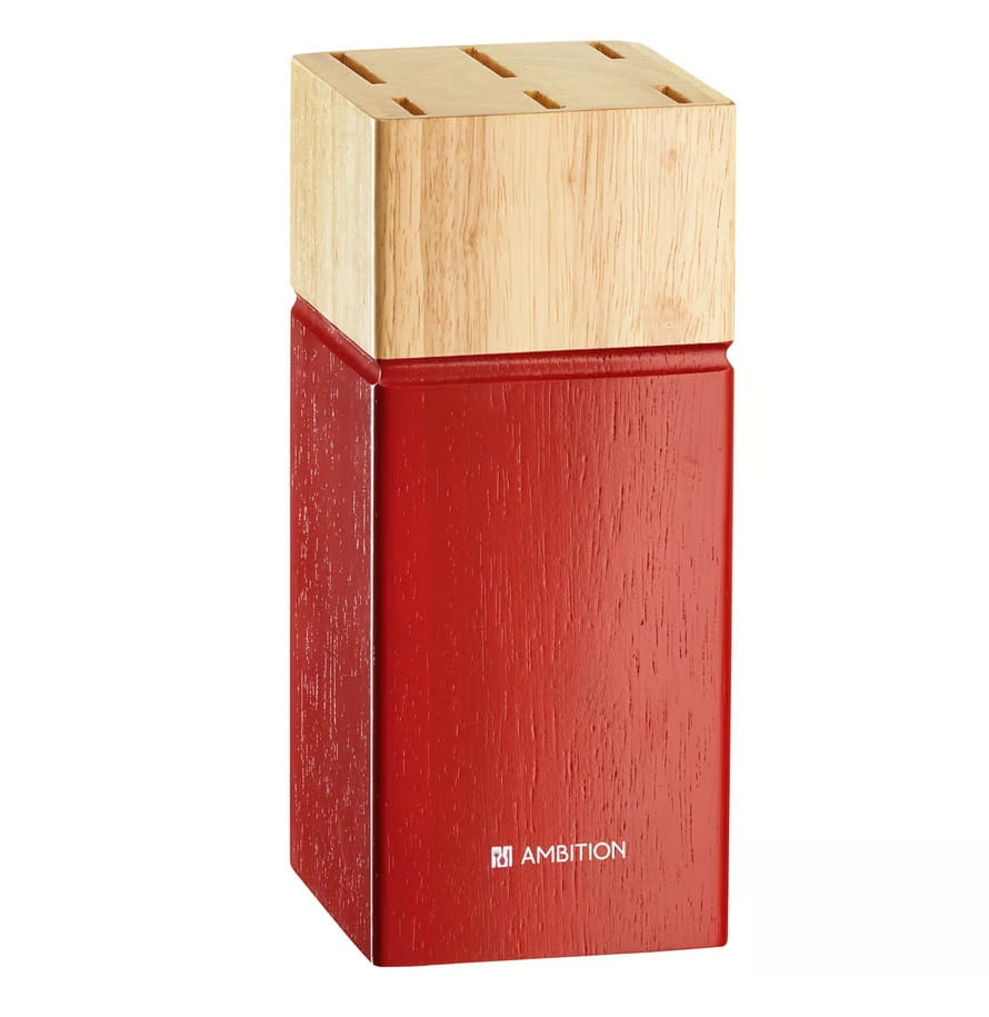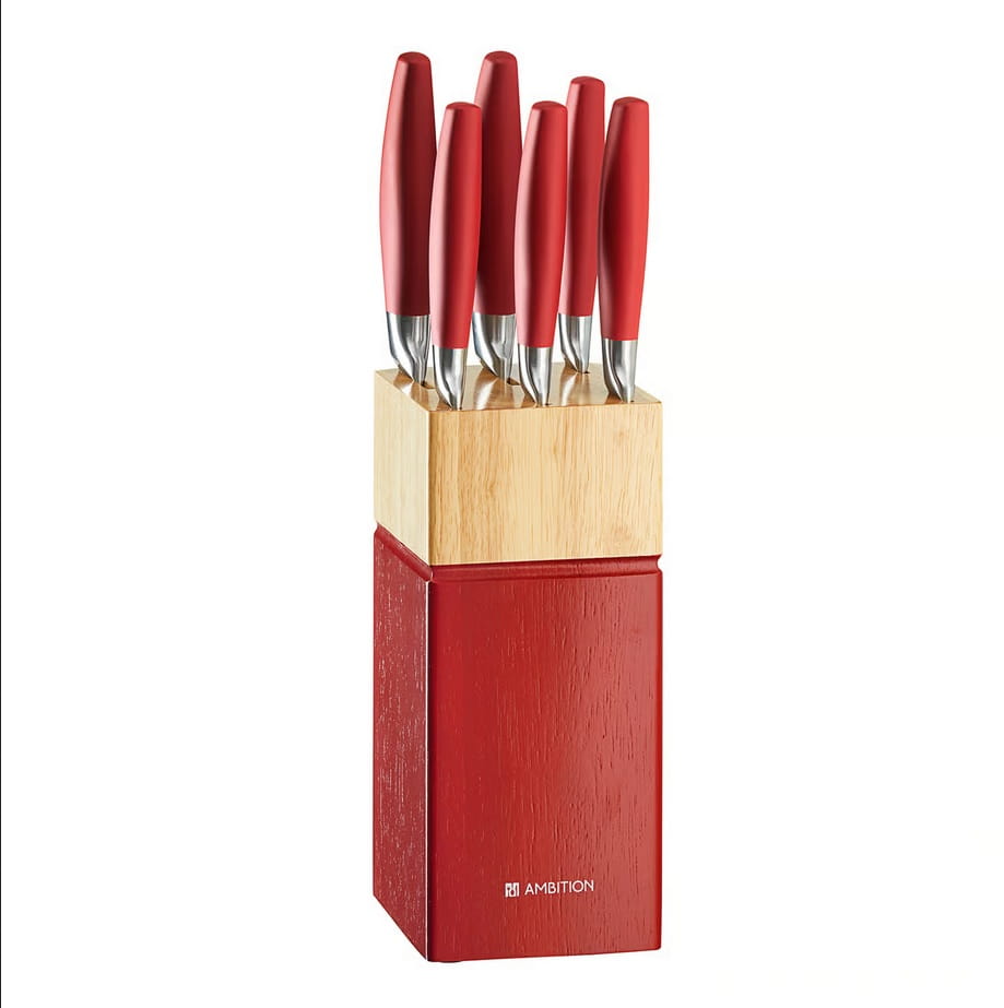 Piękny i stylowy zestaw noży w bloku utrzymanym w czerwonej barwie, to niezbędny produkt w każdej kuchni.