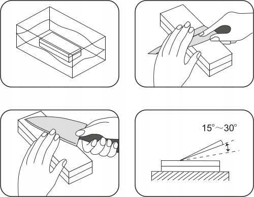 By naostrzyć nóż, przesuń po kamieniu (lekko dociskając) kilkukrotnie najpierw jedną, potem drugą stronę noża. Ostrząc nóż staraj się zachować odpowiedni kąt pochylenia noża (15°-30°)