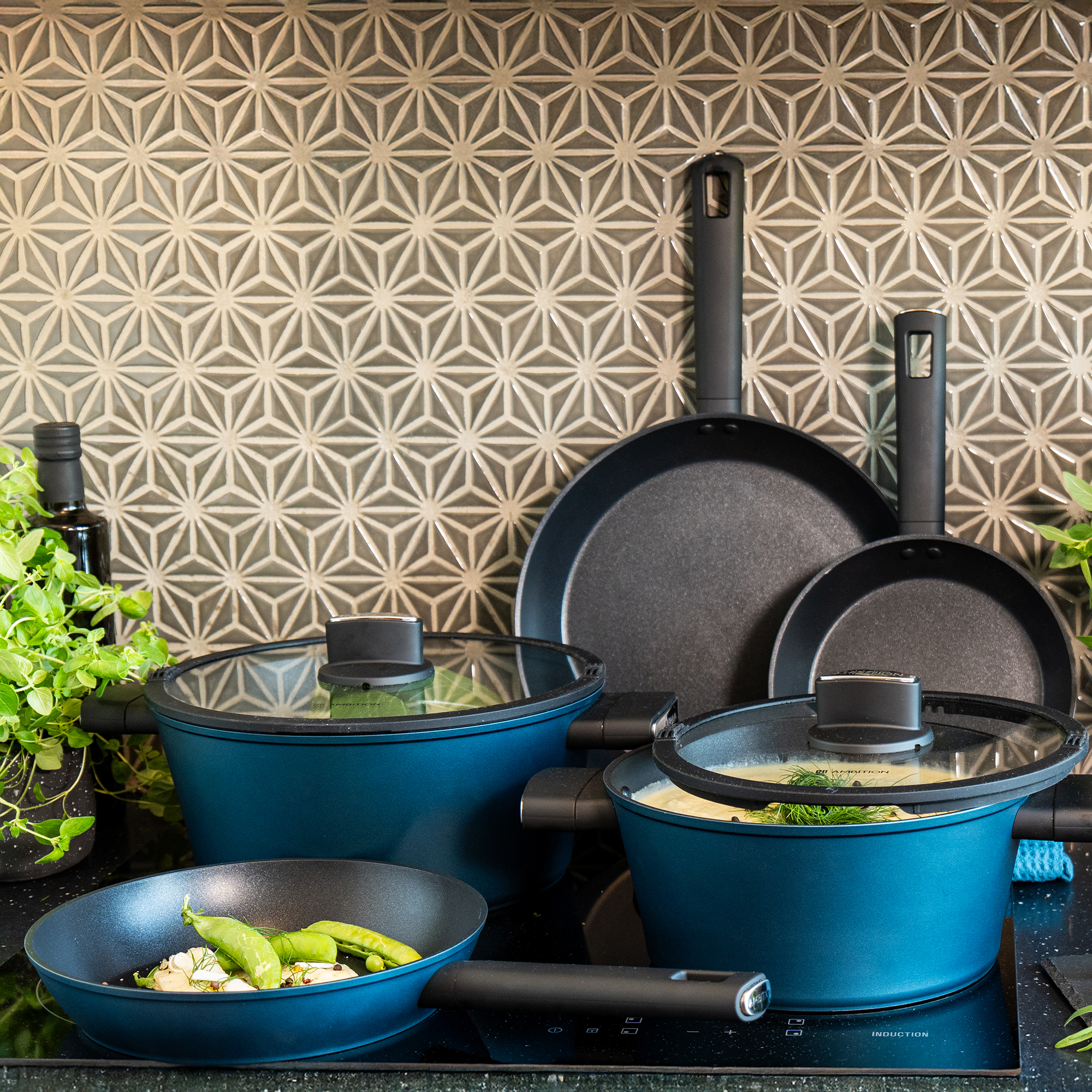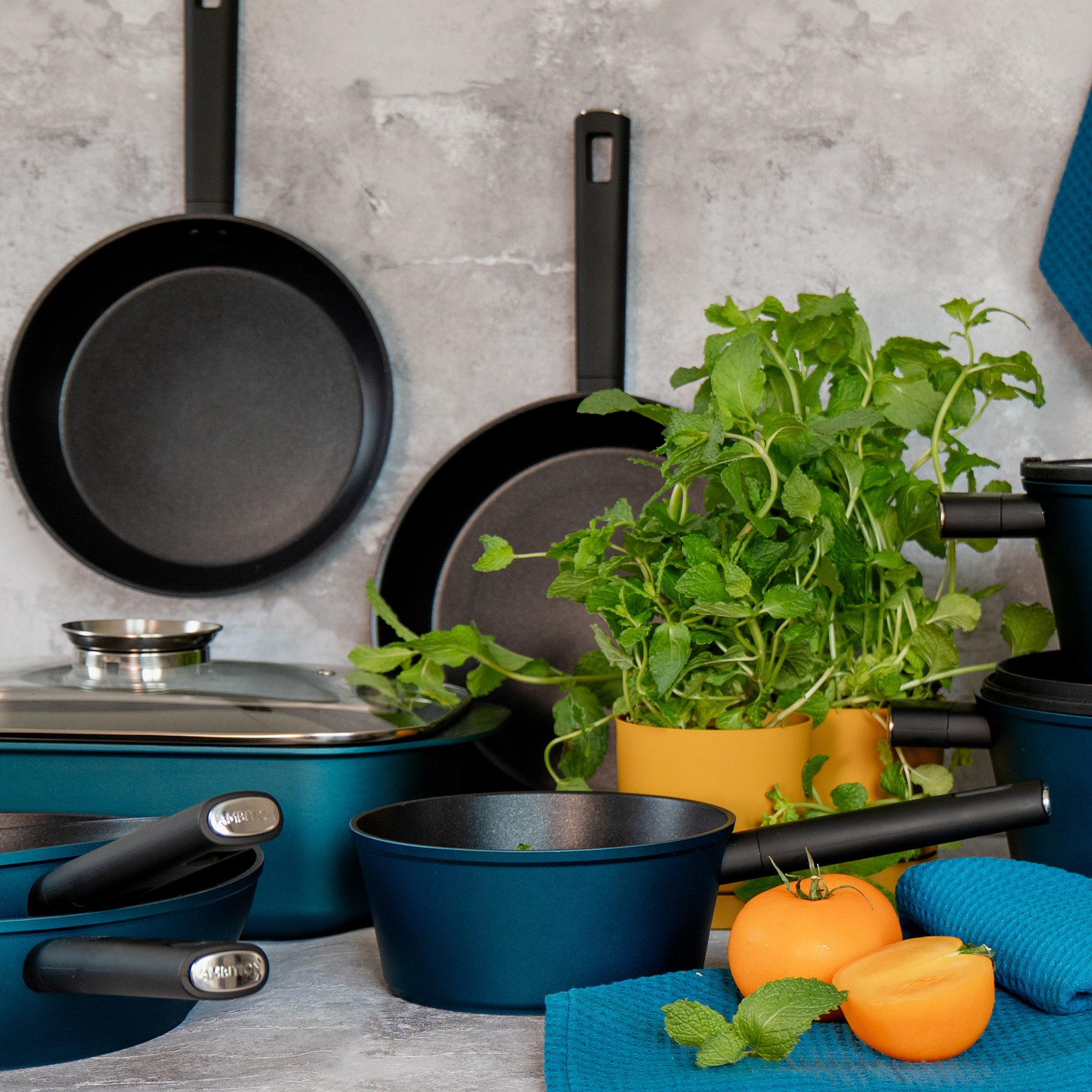 Patelnia Azzurro o średnicy 28 cm to praktyczne naczynie wykonane z odkuwanego aluminium, które szybko i równomiernie się nagrzewa oraz długo utrzymuje ciepło. Wnętrze pokryto powłoką Qualum Basic o właściwościach nieprzywierających, co ułatwia smażenie i czyszczenie. Dzięki solidnemu dnu indukcyjnemu patelnia nadaje się do wszystkich rodzajów kuchenek, także indukcyjnych. Wygodny uchwyt Soft Touch dobrze leży w dłoni i zwiększa komfort użytkowania. Modne perłowe wykończenie w kolorze Transformative Teal sprawia, że patelnia łączy funkcjonalność z nowoczesnym wyglądem.