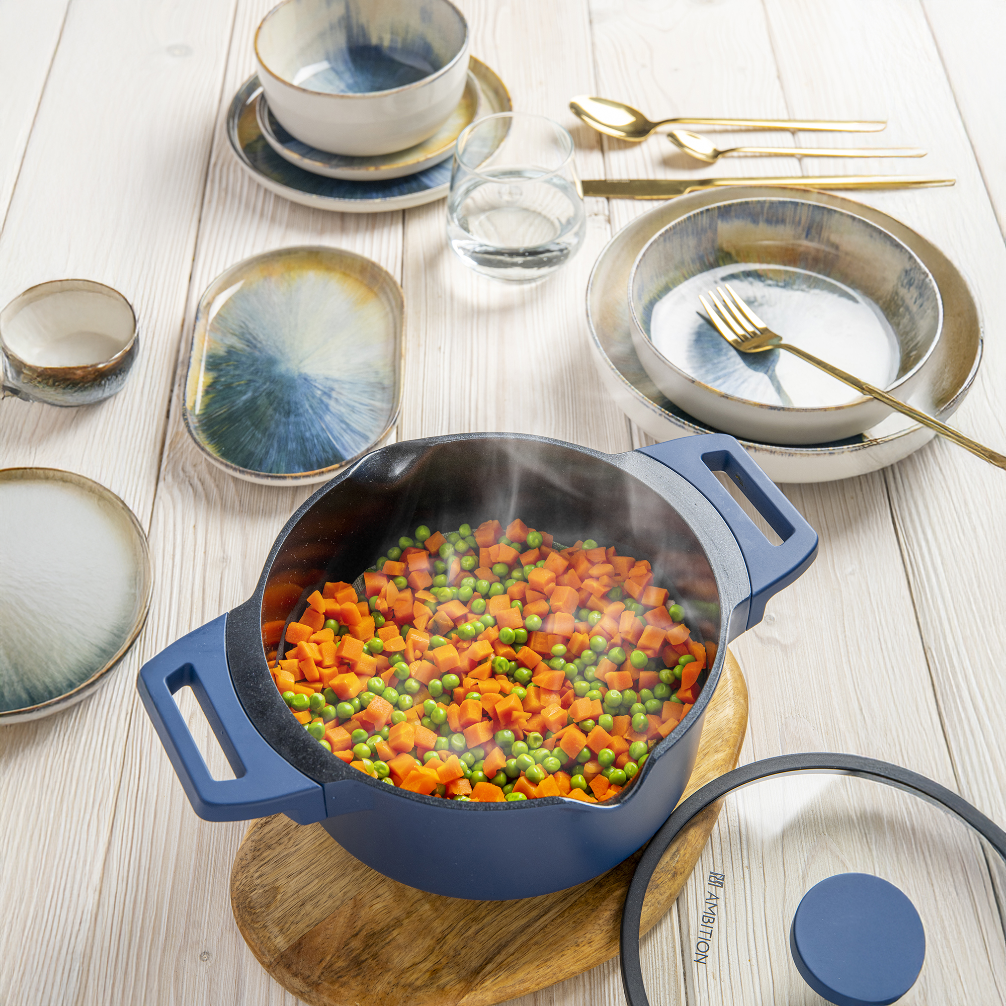 Patelnia Ambition z kolekcji Cobalt o średnicy 26 cm to połączenie nowoczesnego wzornictwa z wysoką funkcjonalnością. Wykonana z wytrzymałego odlewanego aluminium, charakteryzuje się dużą odpornością na odkształcenia oraz doskonałym przewodzeniem ciepła. Grube ścianki skutecznie akumulują temperaturę, umożliwiając równomierne i energooszczędne smażenie.