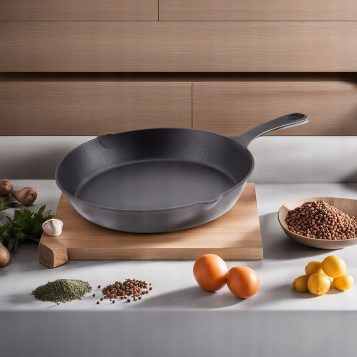 Patelnia jest fabrycznie czerniona, czyli wypalana w tłuszczu co zapewnia żeliwu impregnację i zabezpiecza przed przywieraniem potraw.