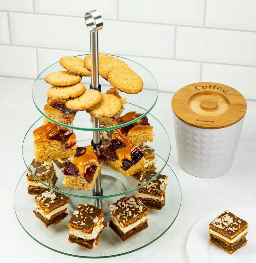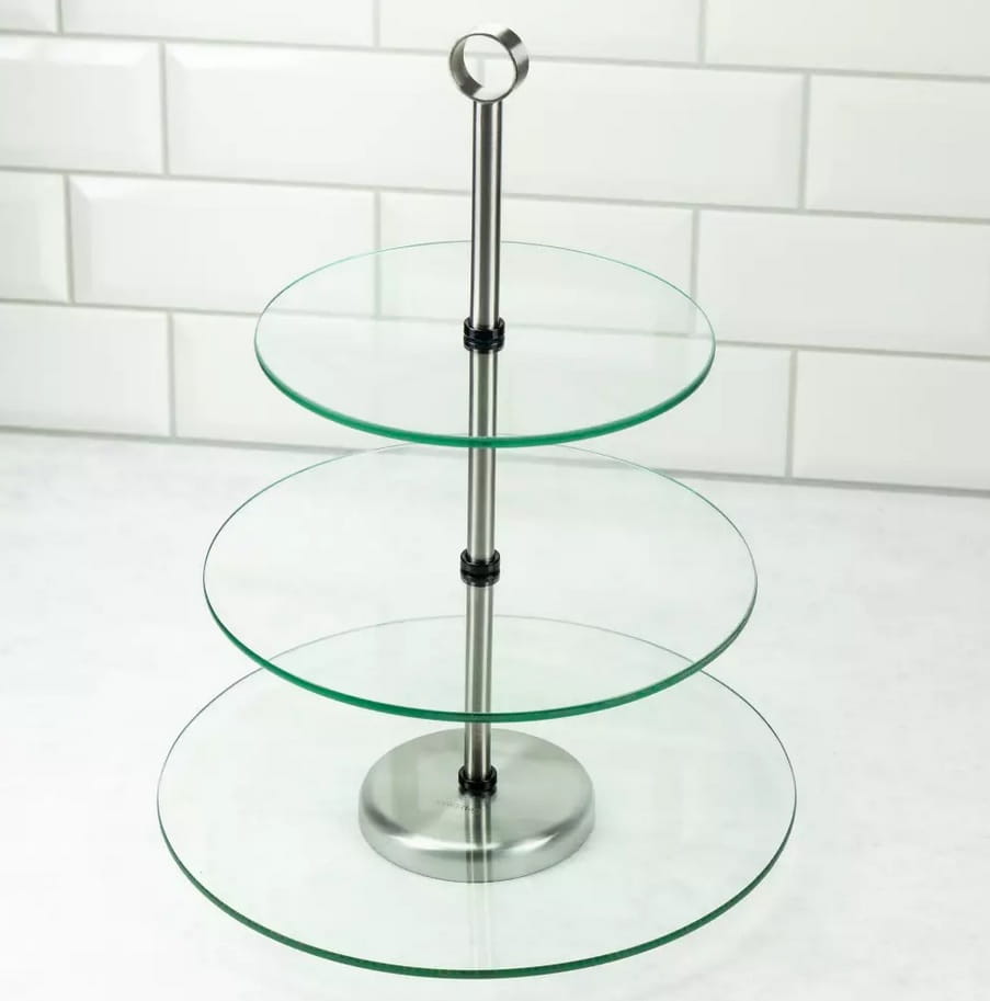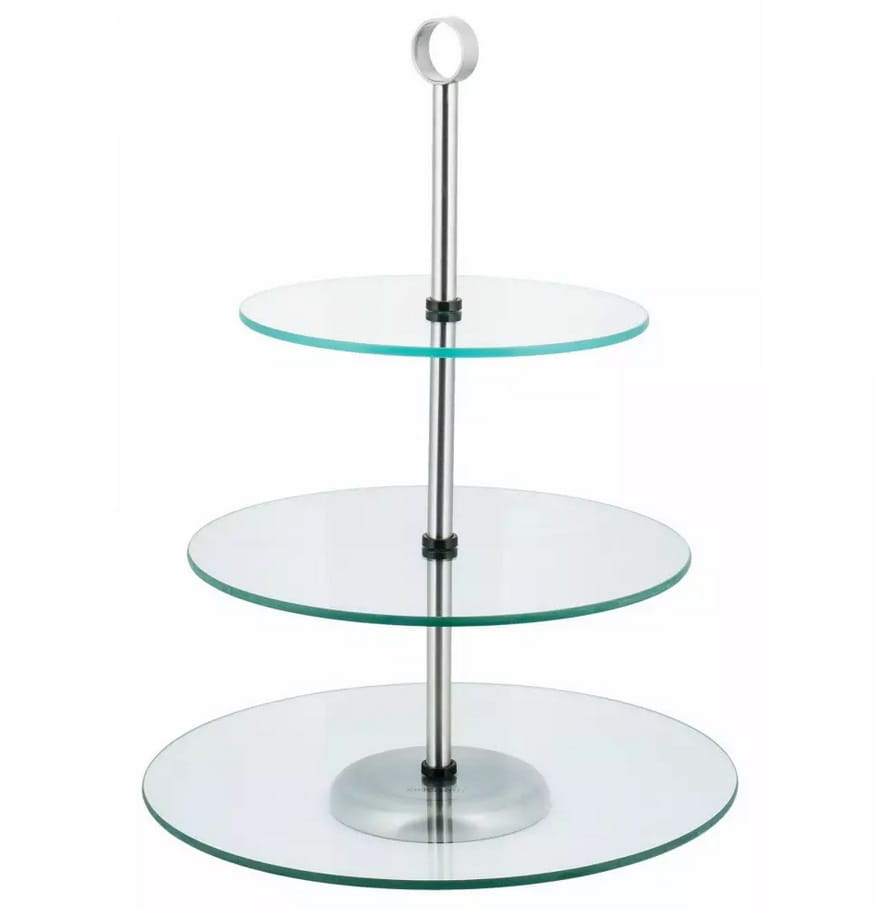 Okrągła, trójpoziomowa patera została wykonana ze szkła i stali nierdzewnej. Dzięki klasycznemu kształtowi pasuje się do każdej jadalni. Jest trzypoziomowa, dlatego możesz oszczędzić miejsce na stole. Dodatkowo dzięki uchwytowi można wygodnie przeniesiesz ją z miejsca na miejsce, także wraz z zawartością.