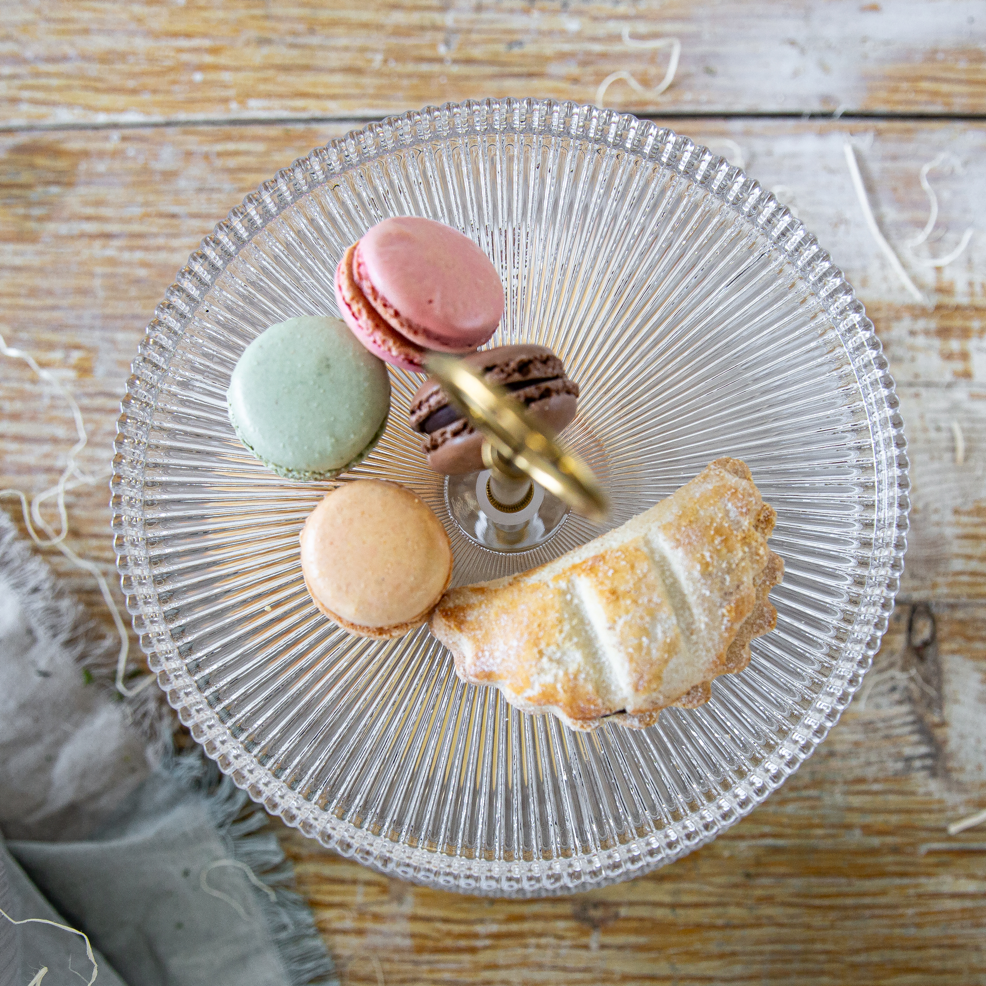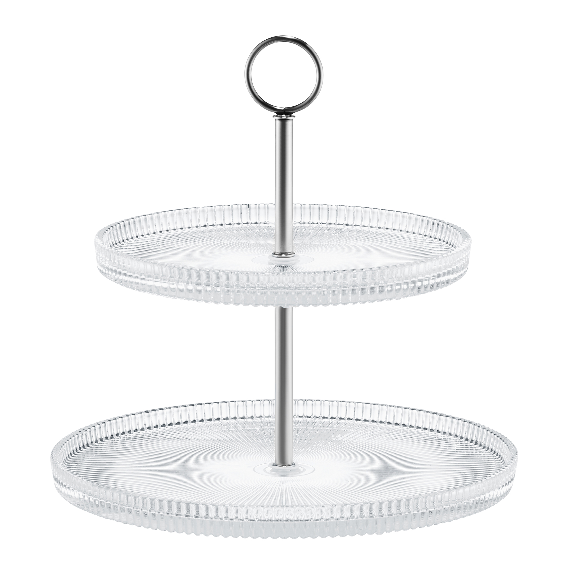 Dwupoziomowa patera Curly to elegancki i praktyczny dodatek do każdego stołu. Wykonana z transparentnego, ryflowanego szkła w połączeniu ze srebrnym wykończeniem, doskonale sprawdzi się podczas serwowania ciast, owoców i przekąsek. To idealne rozwiązanie na rodzinne uroczystości, przyjęcia oraz codzienne spotkania przy kawie.