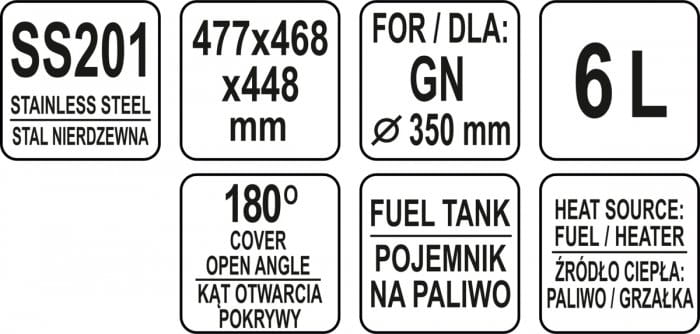 W zestawie posiada pojemnik GN 1/1 o wysokości 65mm wykonany ze stali nierdzewnej o pojemności 9L. Ponadto podgrzewacz ma 2 pojemniki na pastę. Przystosowany jest także do zamocowania grzałki pod spodem pojemnika.