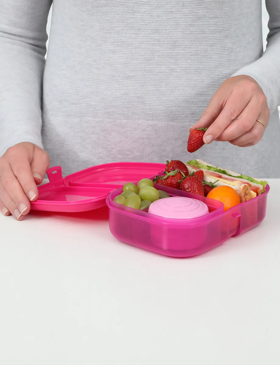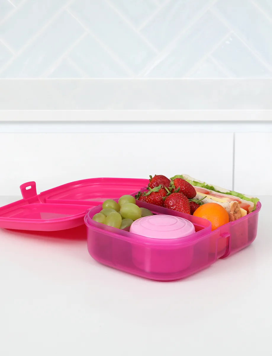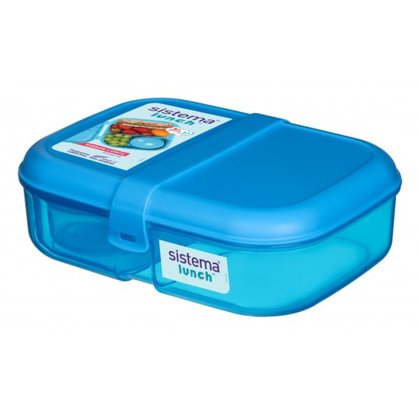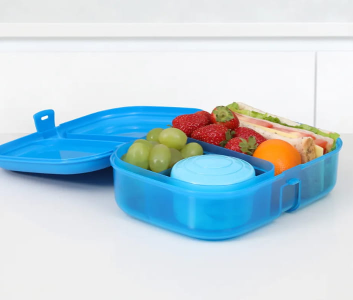 - Funkcjonalny, innowacyjny pojemnik do zapakowania drugiego śniadania. Posiada wiele przegródek - jedną większą, która pomieści pożywne kanapki i dwie mniejsze, od góry na bakalie czy mniejsze owoce. W zestawie znajduję się również zamykany pojemnik np. na sos, a wszystko to pozwala na zabranie obfitego i zróżnicowanego posiłku.