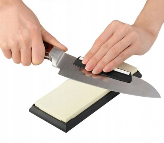 Prowadnica do ostrzenia noży na kamieniach wodnych pozwala na utrzymanie stałego, prawidłowego jąta nachylenia noża względem ostrzałki.