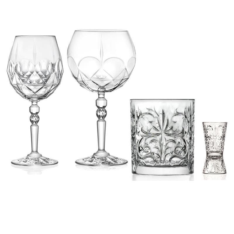 4-elementowy zestaw kieliszków i szklanek został wykonany z wysokiej jakości szkła kryształowego, ekologicznego (w 100% nadaje się recyklingu). Szkło kryształowe marki RCR jest idealnie przejrzyste, wyjątkowo błyszczy i wydaje przyjemne dźwięki np. podczas toastu. Zestaw zawiera 4 elementy: kieliszek do koktajli alkoholowych np. Aperol Spritz lub do wina, 1 kieliszek do ginu z tonikiem lub wody, szklankę do whisky oraz kieliszek do wódki/miarkę barmańską. Komplet jest idealnym prezentem na wyjątkowe okazje.
