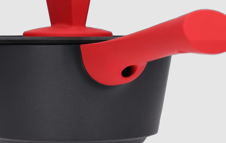 POKRYWA – powierzchnia ze szkła hartowanego, subtelny, nierzucający się w oczy otwór odprowadzający nadmiar pary, uszczelniający, silikonowy rant oraz duży, bezpieczny i wygodny w użyciu uchwyt z powłoką soft touch