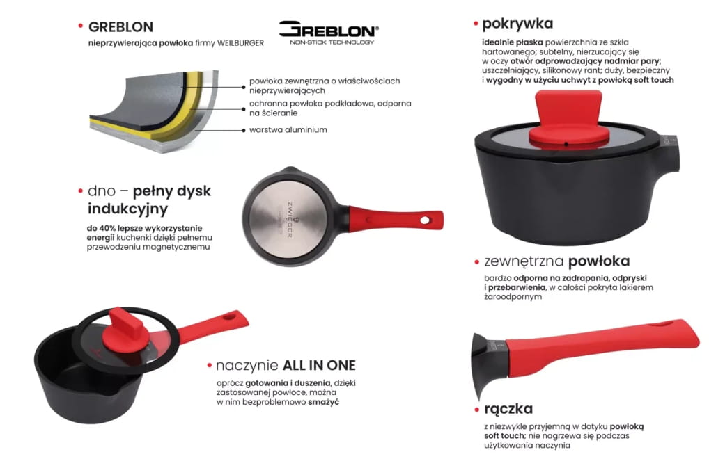ALL IN ONE – w jednym naczyniu, oprócz gotowania, możemy smażyć jak na patelni, dusić oraz zapiekać jak w brytfannie, a nawet piec ciasta (bez pokrywy!)