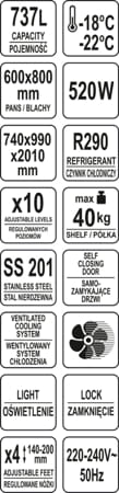 - 10 poziomów z prowadnicami (przeznaczonych na blachy piekarnicze) o wymiarach 600 x 800 mm i max. obciążeniu 40 kg każdy