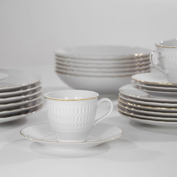 Składający się z 25 elementów zestaw obiadowy dla 6 osób idealnie nadaje się na eleganckie kolacje, rodzinne obiady oraz kameralne spotkania, dodając każdemu posiłkowi wyrafinowanego blasku. Delikatna, ręcznie malowana złota linia na krawędziach fasonu podkreśla ich klasyczny kształt i nadaje zastawie wyjątkowego, eleganckiego charakteru.