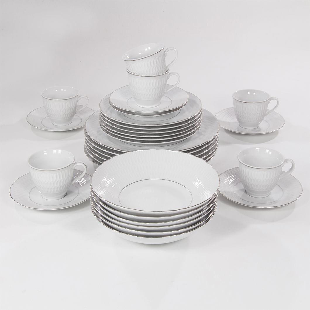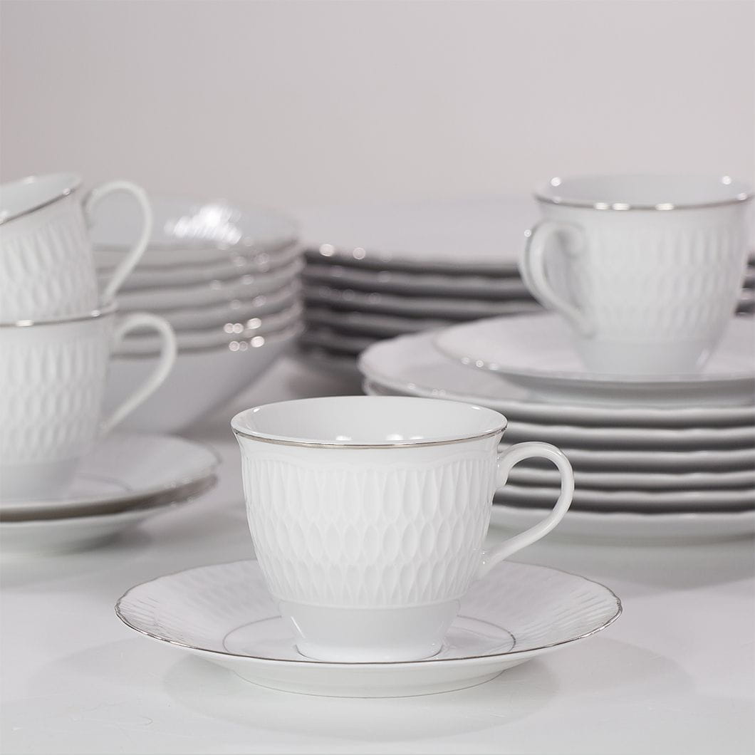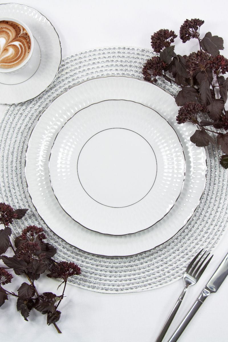 Każdy element serwisu dla 6 osób Sofia Platynowa Linia wykonany jest z najwyższej jakości porcelany. Szlachetny fason z reliefem i subtelnym, platynowym wykończeniem doskonale sprawdzi się w wielu aranżacjach stołowych.