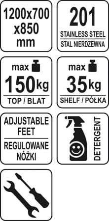 Stół centralny z półką wykonany jest z wysokiej jakości stali nierdzewnej SS201 przystosowanej do stosowania w gastronomii w warunkach intensywnej eksploatacji.