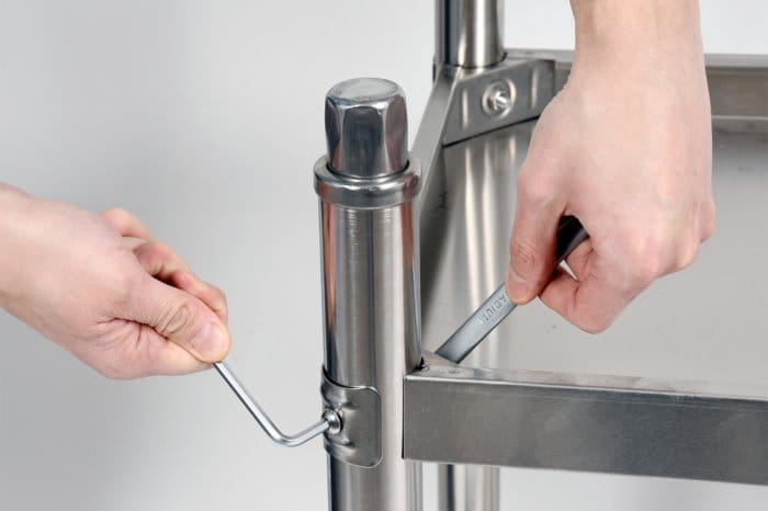 Nogi stołu wykonane z okrągłych profili posiadają regulację wysokości w zakresie +/-15mm, co pozwala na wypoziomowanie stołu nawet na nierównych podłożach. Ponadto posiadają podkładki plastikowe, które zabezpieczają podłogę przed zarysowaniem.