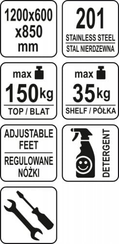 Stół centralny skręcany z półką marki YATO o wymiarach 1200(sz)x600(gł)x850(wys).